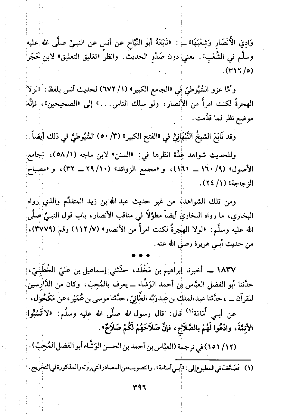 ومن تلك الشواهد من غير حديث عبد اللَّه بن زيد المتقدِّم والذي رواه البخاري، ما رواه البخاري أيضًا مطوَّلًا في مناقب الأنصار، باب قول النبيِّ صلَّى اللَّه عليه وسلَّم: "لولا الهجرةُ لكنت امرأً من الأنصار" (٧/ ١١٢) رقم (٣٧٧٩)، من حديث أبي هريرة رضي اللَّه عنه.