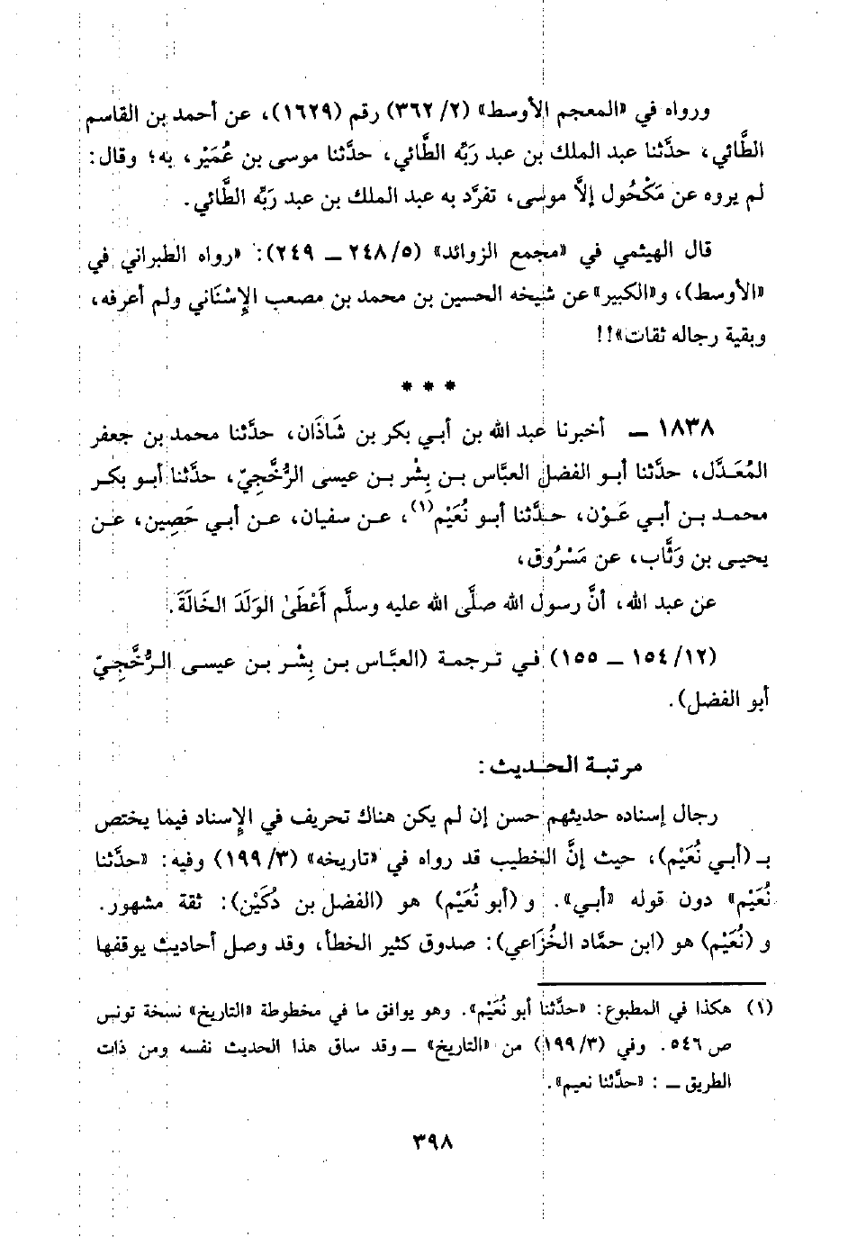 قال الهيثمي في "مجمع الزوائد" (٥/ ٢٤٨ - ٢٤٩): "رواه الطبراني في "الأوسط"، و"الكبير" عن شيخه الحسين بن محمد بن مصعب الإسْنَاني ولم أعرفه، وبقية رجاله ثقات"!!
