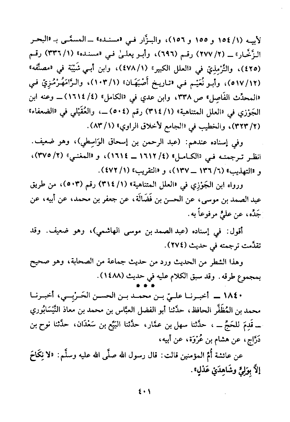 عن عائشة أُمِّ المؤمنين قالت: قال رسول اللَّه صلَّى اللَّه عليه وسلَّم: "لا نِكَاحَ إلَّا بِوَلِيٍّ وشَاهِدَيْ عَدْلٍ".