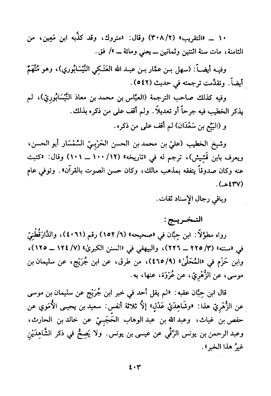 قال ابن حِبَّان عقبه: "لم يقل أحد في خبر ابن جُرَيْج عن سليمان بن موسى عن الزُّهْرِيّ هذا: "وشَاهِدَيْ عَدْلٍ" إلَّا ثلاثة أنفسٍ: سعيد بن يحيى الأُمَوي عن حفص بن غياث، وعبد اللَّه بن عبد الوهاب الحَجَبِيّ عن خالد بن الحارث، وعبد الرحمن بن يونس الرَّقِّي عن عيسى بن يونس. ولا يَصِحُّ في ذكر الشَّاهِدَيْنِ غيرُ هذا الخبر".