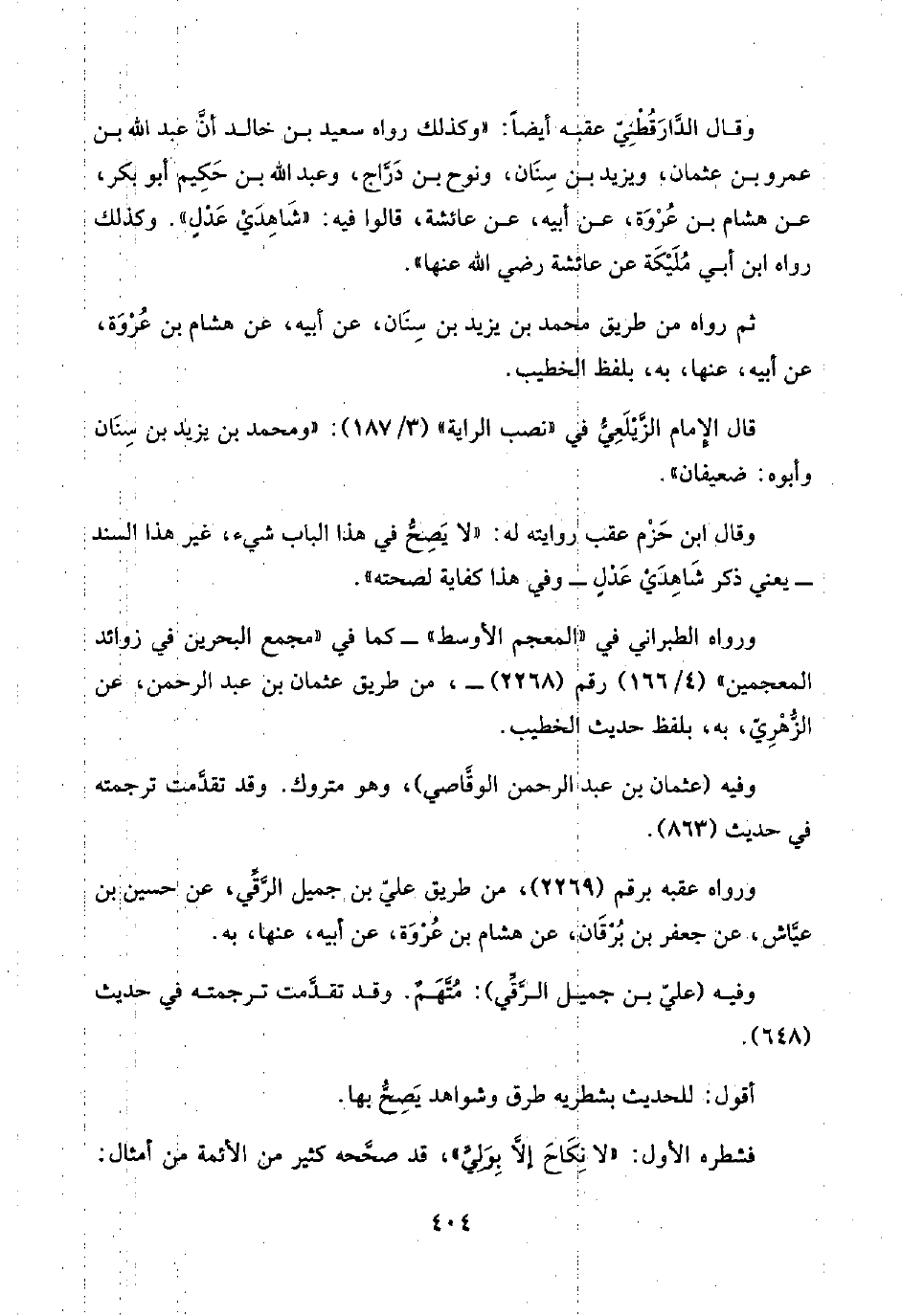 وقال الدَّارَقُطْنِيّ عقبه أيضًا: "وكذلك رواه سعيد بن خالد أنَّ عبد اللَّه بن عمرو بن عثمان، ويزيد بن سِنَان، ونوح بن دَرَّاج، وعبد اللَّه بن حَكِيم أبو بكر، عن هشام بن عُرْوَة، عن أبيه، عن عائشة، قالوا فيه: "شَاهِدَيْ عَدْلٍ". وكذلك رواه ابن أبي مُلَيْكَةَ عن عائشة رضي اللَّه عنها".