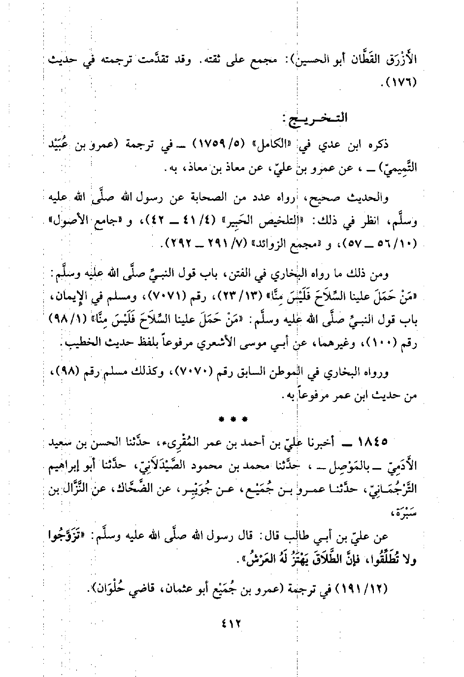 ١٨٤٥ - أخبرنا عليّ بن أحمد بن عمر المُقْرِئ، حدَّثنا الحسن بن سعيد الأَدَمِيّ -بالمَوْصِل-، حدَّثنا محمد بن محمود الصَّيْدَلَانِيّ، حدَّثنا أبو إبراهيم التَّرْجُمَانِيّ، حدَّثنا عمرو بن جُمَيْع، عن جُوَيْبِر، عن الضَّحَّاك، عن النَّزَّال بن سَبْرَة،