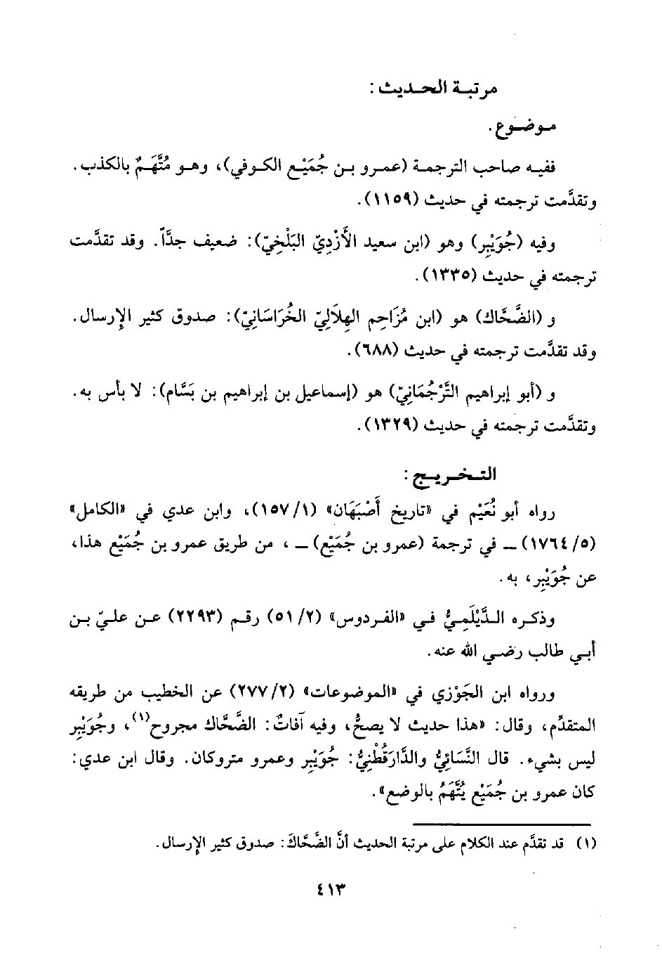 ورواه ابن الجَوْزي في "الموضوعات" (٢/ ٢٧٧) عن الخطيب من طريقه المتقدِّم، وقال: "هذا حديث لا يصحُّ، وفيه آفاتٌ: الضَّحَّاك مجروح (¬١)، وجُوَيْبِر ليس بشيء. قال النَّسَائِيُّ والدَّارَقُطْنِيُّ: جُوَيْبِر وعمرو متروكان. وقال ابن عدي: كان عمرو بن جُمَيْع يُتَّهَمُ بالوضع".