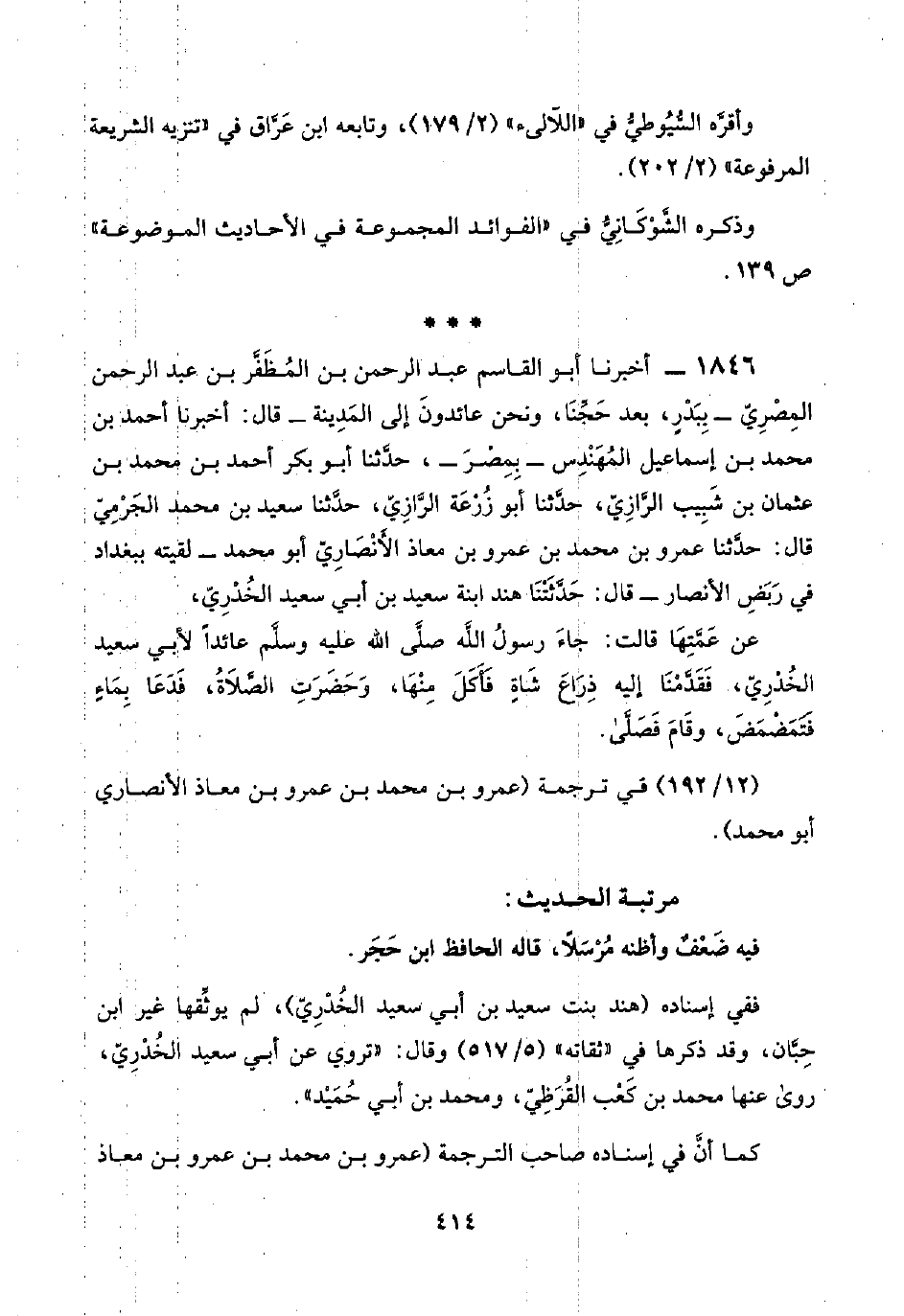 ١٨٤٦ - أخبرنا أبو القاسم عبد الرحمن بن المُظَفَّر بن عبد الرحمن المِصْرِيّ -بِبَدْرٍ، بعد حَجَّنَا، ونحن عائدونَ إلى المَدِينة- قال: أخبرنا أحمد بن محمد بن إسماعيل المُهَنْدِس -بِمِصْرَ-، حدَّثنا أبو بكر أحمد بن محمد بن عثمان بن شَبِيب الرَّازِيّ، حدَّثنا أبو زُرْعة الرَّازِيّ، حدَّثنا سعيد بن محمد الجَرْمِيّ قال: حدَّثنا عمرو بن محمد بن عمرو بن معاذ الأَنْصَارِيّ أبو محمد -لقيته ببغداد في رَبَضِ الأنصار- قال: حَدَّثَتْنَا هند ابنة سعيد بن أبي سعيد الخُدْرِيّ،