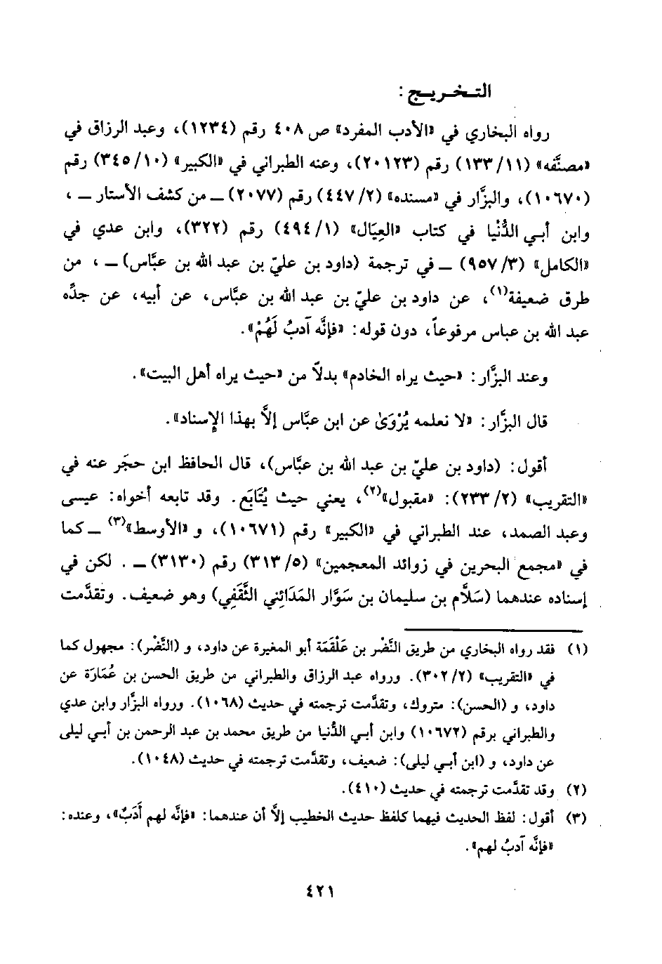 رواه البخاري في "الأدب المفرد" ص ٤٠٨ رقم (١٢٣٤)، وعبد الرزاق في "مصنَّفه" (١١/ ١٣٣) رقم (٢٠١٢٣)، وعنه الطبراني في "الكبير" (١٠/ ٣٤٥) رقم (١٠٦٧٠)، والبزَّار في "مسنده" (٢/ ٤٤٧) رقم (٢٠٧٧) -من كشف الأستار-، وابن أبي الدُّنْيَا في كتاب "العِيَال" (١/ ٤٩٤) رقم (٣٢٢)، وابن عدي في "الكامل" (٣/ ٩٥٧) -في ترجمة (داود بن عليّ بن عبد اللَّه بن عبَّاس) -، من طرق ضعيفة (¬١)، عن داود بن عليّ بن عبد اللَّه بن عبَّاس، عن أبيه، عن جدِّه عبد اللَّه بن عباس مرفوعًا، دون قوله: "فإنَّه آدبُ لَهُمْ".