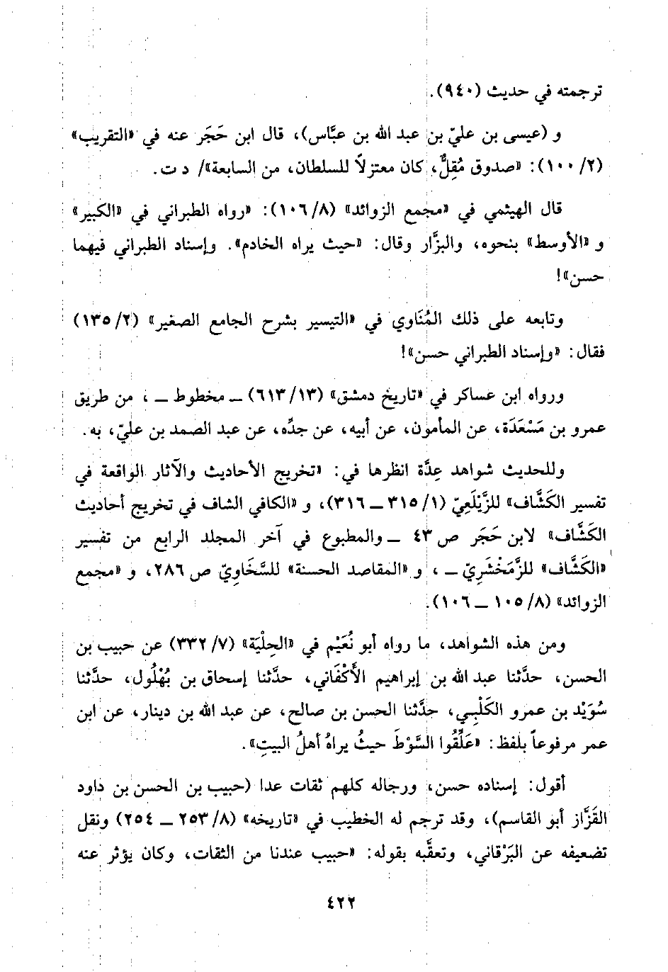 أقول: إسناده حسن، ورجاله كلهم ثقات عدا: (حبيب بن الحسن بن داود القَزَّاز أبو القاسم)، وقد ترجم له الخطيب في "تاريخه" (٨/ ٢٥٣ - ٢٥٤) ونقل تضعيفه عن البَرْقاني، وتعقَّبه بقوله: "حبيب عندنا من الثقات، وكان يؤثر عنه