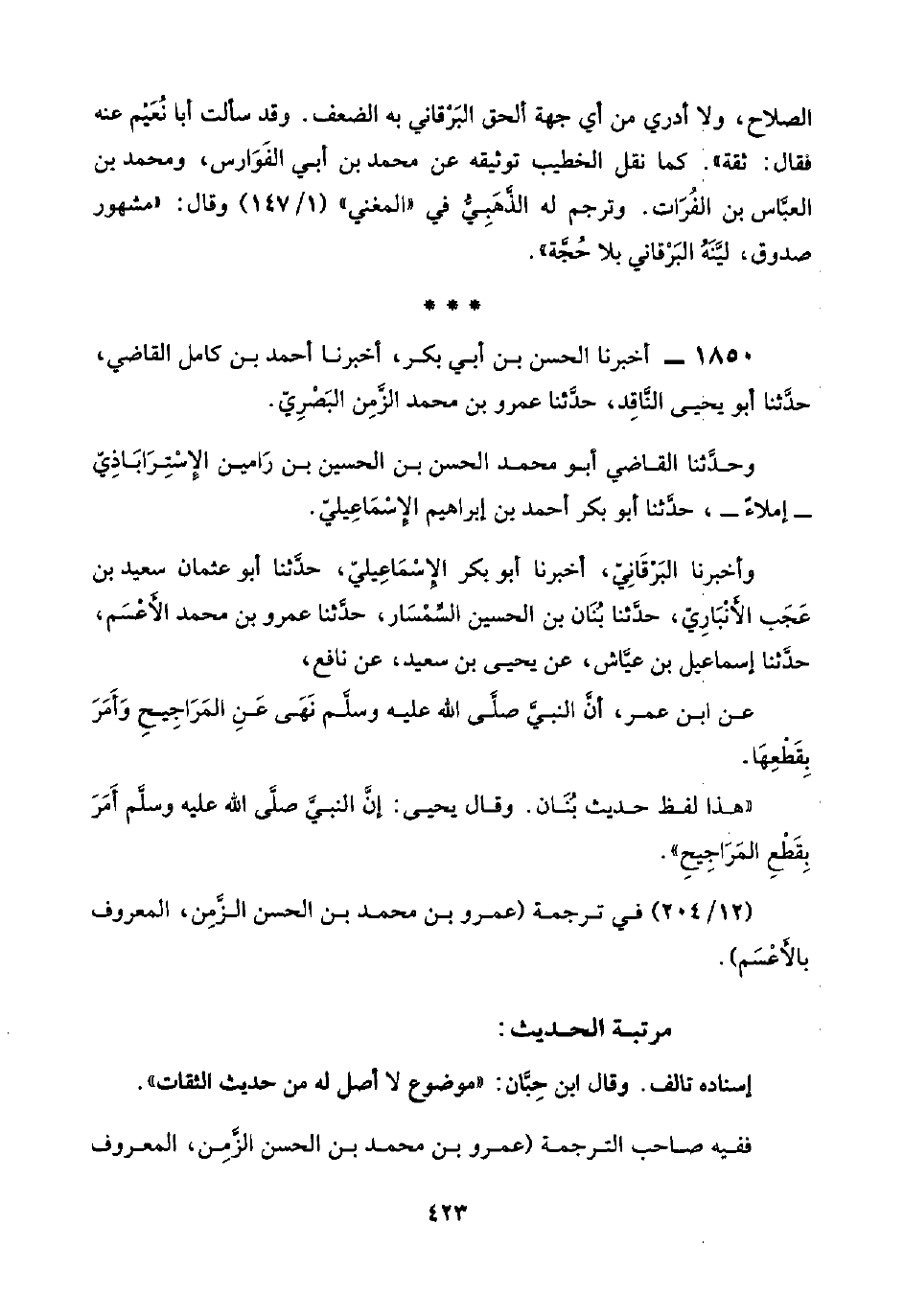 وأخبرنا البَرْقَانِيّ، أخبرنا أبو بكر الإسْمَاعِيليّ، حدَّثنا أبو عثمان سعيد بن عَجَب الأَنْبَارِيّ، حدَّثنا بُنَان بن الحسين السِّمْسَار، حدَّثنا عمرو بن محمد الأَعْسَم، حدَّثنا إسماعيل بن عيَّاش، عن يحيى بن سعيد، عن نافع،