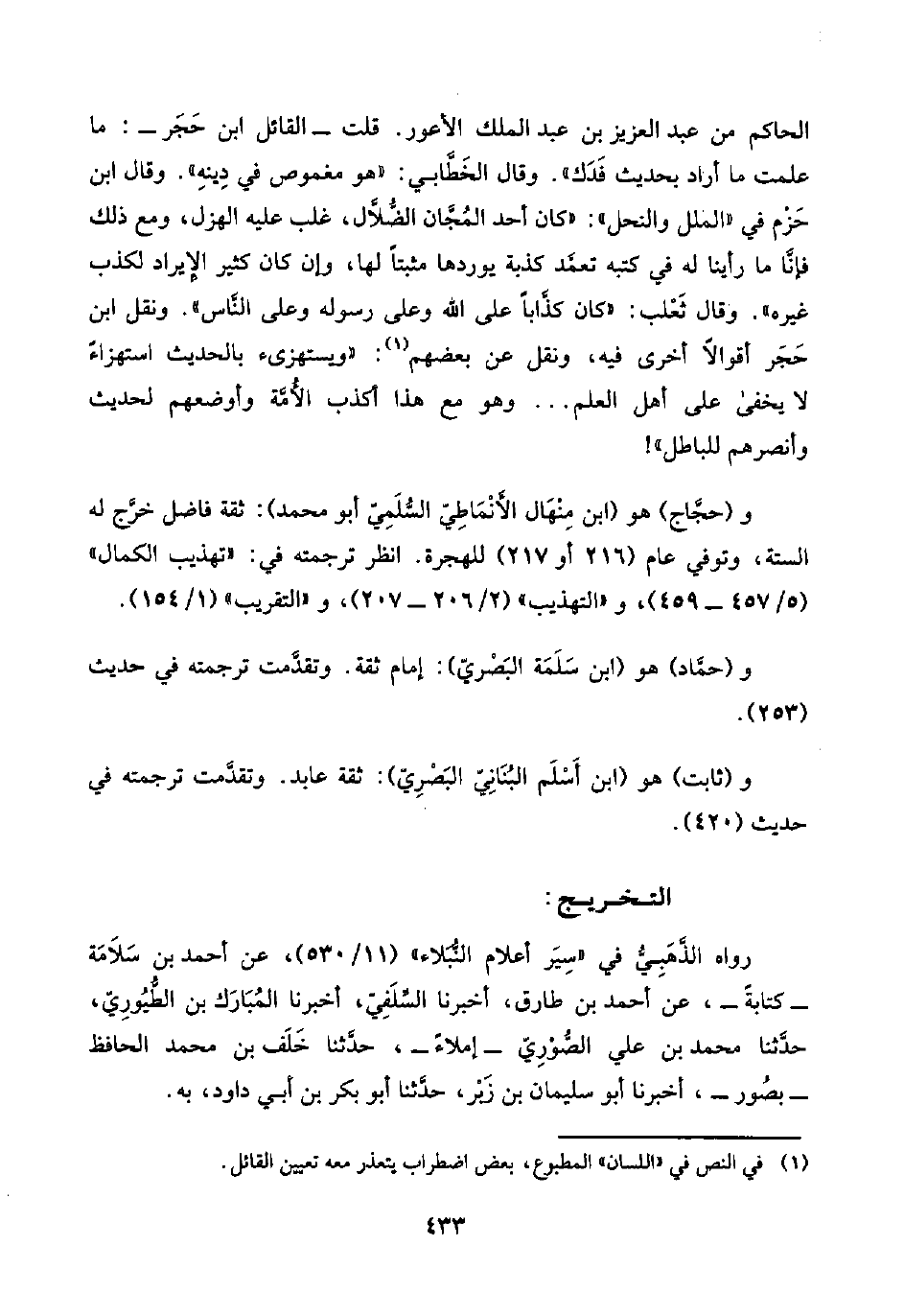 و(حجَّاج) هو (ابن مِنْهَال الأَنْمَاطِيّ السُّلَمِيّ أبو محمد): ثقة فاضل خرَّج له الستة، وتوفي عام (٢١٦ أو ٢١٧) للهجرة. انظر ترجمته في: "تهذيب الكمال" (٥/ ٤٥٧ - ٤٥٩)، و"التهذيب" (٢/ ٢٠٦ - ٢٠٧)، و"التقريب" (١/ ١٥٤).