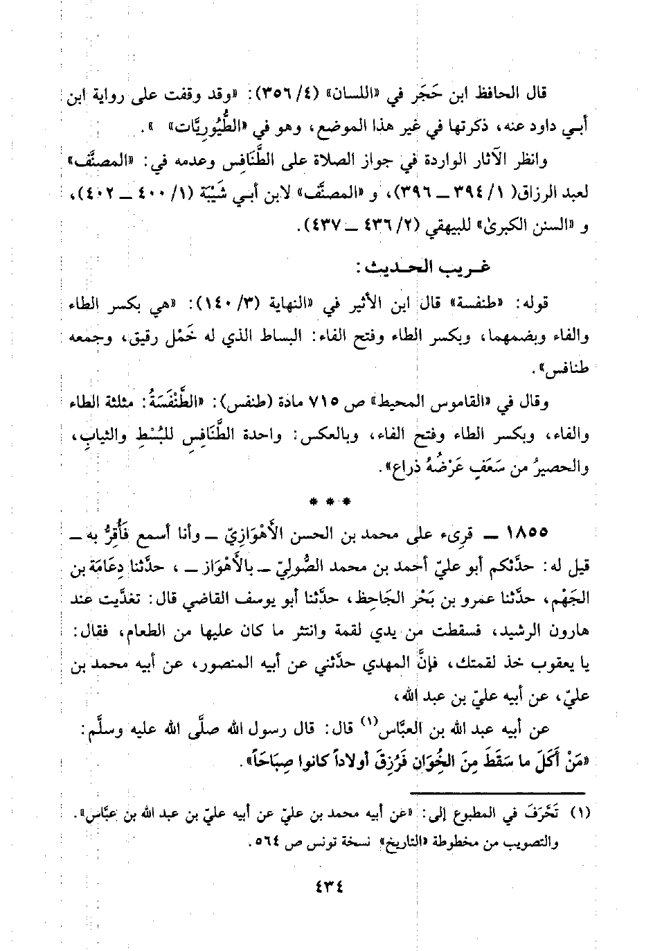 ١٨٥٥ - قرِئ على محمد بن الحسن الأَهْوَازِيّ -وأنا أسمع فَأُقِرُّ به- قيل له: حدَّثكم أبو عليّ أحمد بن محمد الصُّولِيّ -بالأَهْوَاز-، حدَّثنا دِعَامَة بن الجَهْم، حدَّثنا عمرو بن بَحْر الجَاحِظ، حدَّثنا أبو يوسف القاضي قال: تغدَّيت عند هارون الرشيد، فسقطت من يدي لقمة وانتثر ما كان عليها من الطعام، فقال: يا يعقوب خذ لقمتك، فإنَّ المهدي حدَّثني عن أبيه المنصور، عن أبيه محمد بن عليّ، عن أبيه عليّ بن عبد اللَّه،