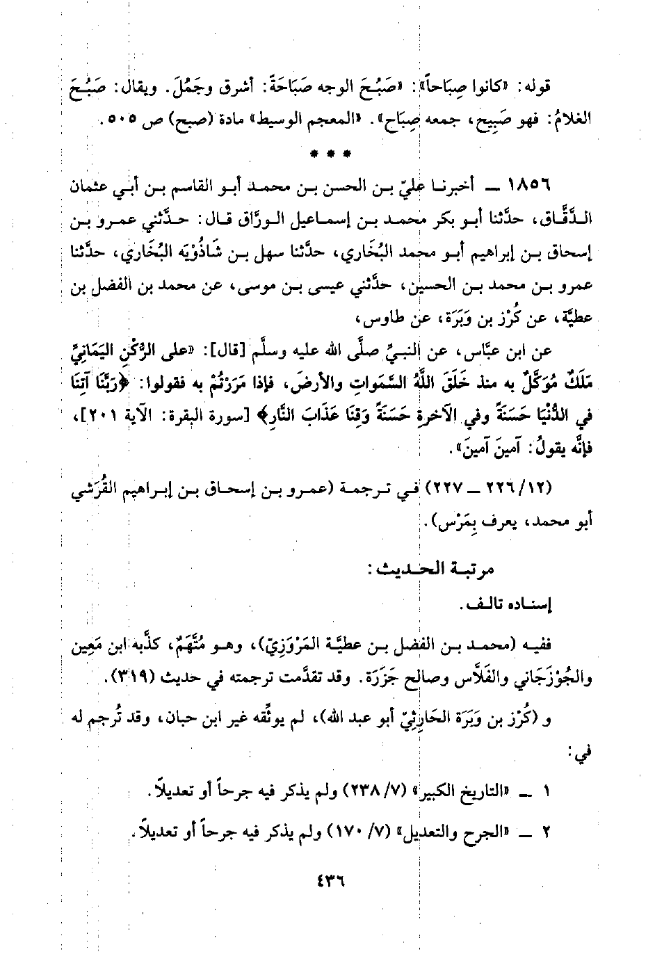 ١٨٥٦ - أخبرنا عليّ بن الحسن بن محمد أبو القاسم بن أبي عثمان الدَّقَّاق، حدَّثنا أبو بكر محمد بن إسماعيل الورَّاق قال: حدَّثني عمرو بن إسحاق بن إبراهيم أبو محمد البُخَاري، حدَّثنا سهل بن شَاذُوْيَه البُخَاري، حدَّثنا عمرو بن محمد بن الحسين، حدَّثني عيسى بن موسى، عن محمد بن الفضل بن عطيَّة، عن كُرْز بن وَبَرَة، عن طاوس،