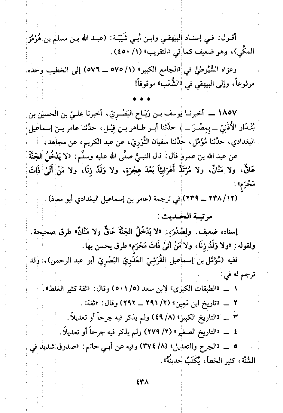 ١٨٥٧ - أخبرنا يوسف بن رَبَاح البَصْرِيّ، أخبرنا عليّ بن الحسين بن بُنْدَار الأَذَنِيّ -بِمِصْرَ-، حدَّثنا أبو طاهر بن فِيْل، حدَّثنا عامر بن إسماعيل البغدادي، حدَّثنا مُؤَمَّل، حدَّثنا سفيان الثَّوْرِيّ، عن عبد الكريم، عن مجاهد،