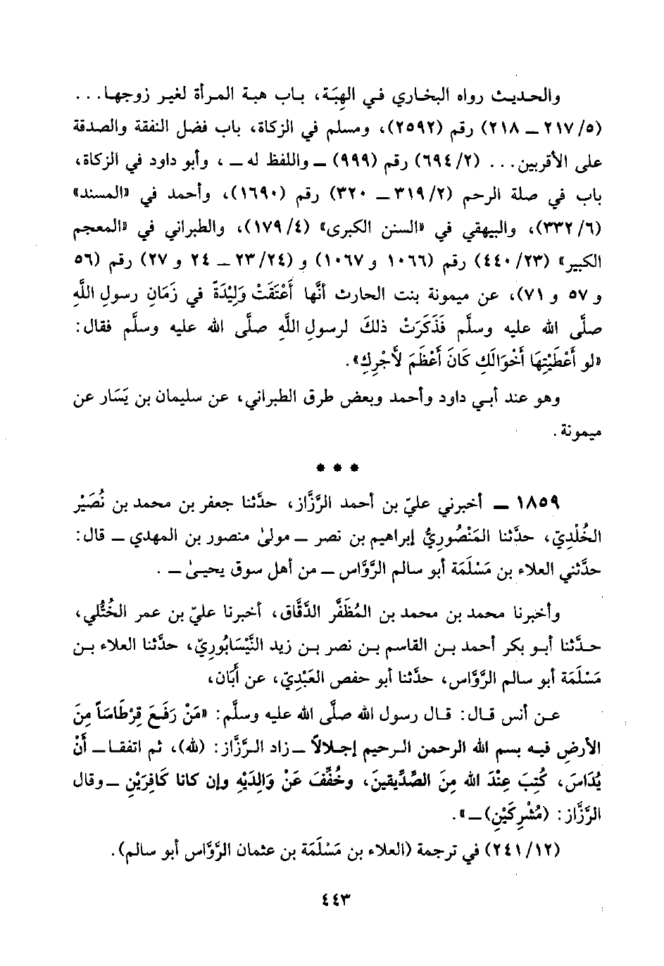 ١٨٥٩ - أخبرني عليّ بن أحمد الرَّزَّاز، حدَّثنا جعفر بن محمد بن نُصَيْر الخُلْدِيّ، حدَّثنا المَنْصُورِيُّ إبراهيم بن نصر -مولى منصور بن المهدي- قال: حدَّثني العلاء بن مَسْلَمَة أبو سالم الرَّوَّاس -من أهل سوق يحيى-.