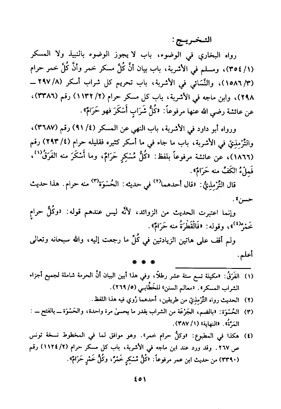 (¬٤) هكذا في المطبوع: "وكلُّ حرام خمر". وهو موافق لما في المخطوط نسخة تونس ص ٢٦٧. وقد ورد عند ابن ماجه في الأشربة، باب كل مسكر حرام (٢/ ١١٢٤) رقم (٣٣٩٠) من حديث ابن عمر مرفوعًا: "كُلُّ مُسْكِرٍ خَمْرٌ، وكُلُّ خَمْرٍ حَرَامٌ".
