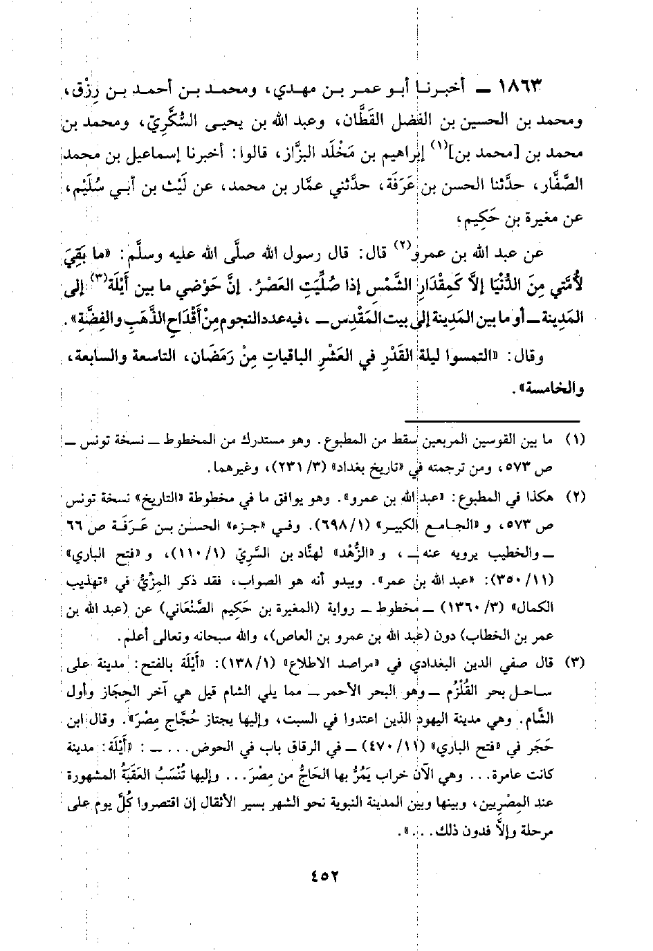 (¬٢) هكذا في المطبوع: "عبد اللَّه بن عمرو". وهو يوافق ما في مخطوطة "التاريخ" نسخة تونس ص ٥٧٣، و"الجامع الكبير" (١/ ٦٩٨)، وفي "جزء" الحسن بن عَرَفَة ص ٦٦ - والخطيب يرويه عنه-، و"الزُّهْد" لهنَّاد بن السَّرِيّ (١/ ١١٠)، و"فتح الباري" (١١/ ٣٥٠): "عبد اللَّه بن عمر". ويبدو أنَّه هو الصَّواب، فقد ذكر المِزِّيُّ في "تهذيب الكمال" (٣/ ١٣٦٠) -مخطوط- رواية (المغيرة بن حَكِيم الصَّنْعَاني) عن (عبد اللَّه بن عمر بن الخَطَّاب) دون (عبد اللَّه بن عمرو بن العاص)، واللَّه سبحانه وتعالى أعلم.