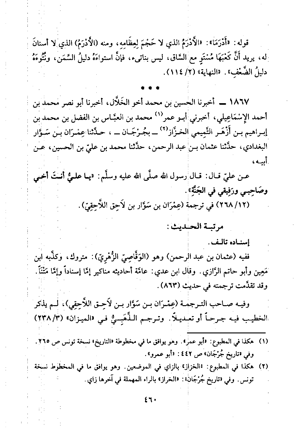 ١٨٦٧ - أخبرنا الحسين بن محمد أخو الخَلَّال، أخبرنا أبو نصر محمد بن أحمد الإسْمَاعِيلي، أخبرني أبو عمر (¬١) محمد بن العبَّاس بن الفضل بن محمد بن إبراهيم بن أَزْهَر التَّمِيمي الخزَّاز (¬٢) -بجُرْجَان-، حدَّثنا عِمْرَان بن سَوَّار البغدادي، حدَّثنا عثمان بن عبد الرحمن، حدَّثنا محمد بن عليّ بن الحسين، عن أبيه،