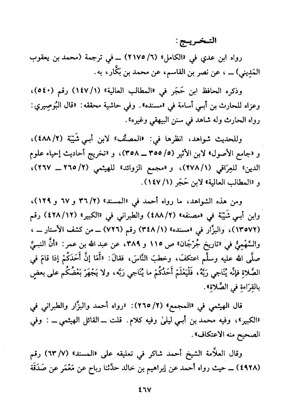 ومن هذه الشواهد، ما رواه أحمد في "المسند" (٢/ ٣٦ و ٦٧ و ١٢٩)، وابن أبي شَيْبَة في "مصنفه" (٢/ ٤٨٨) والطبراني في "الكبير" (١٢/ ٤٢٨) رقم (١٣٥٧٢)، والبزَّار في "مسنده" (١/ ٣٤٨) رقم (٧٢٦) -من كشف الأستار-، والسَّهْمِيُّ في "تاريخ جُرْجَان" ص ١١٥ و ٣٨٩، عن عبد اللَّه بن عمر: "أنَّ النبيَّ صلَّى اللَّه عليه وسلَّم اعتكفَ، وخطبَ النَّاسَ، فقالَ: "أَمَا إنَّ أَحَدَكُمْ إذا قامَ في الصَّلَاةِ فإنَّه يُنَاجي رَبَّه، فَلْيَعْلَم أَحَدُكُم ما يُنَاجي رَبَّه، ولا يَجْهَرْ بَعْضُكُم على بعضٍ بالقِرَاءةِ في الصَّلاةِ".