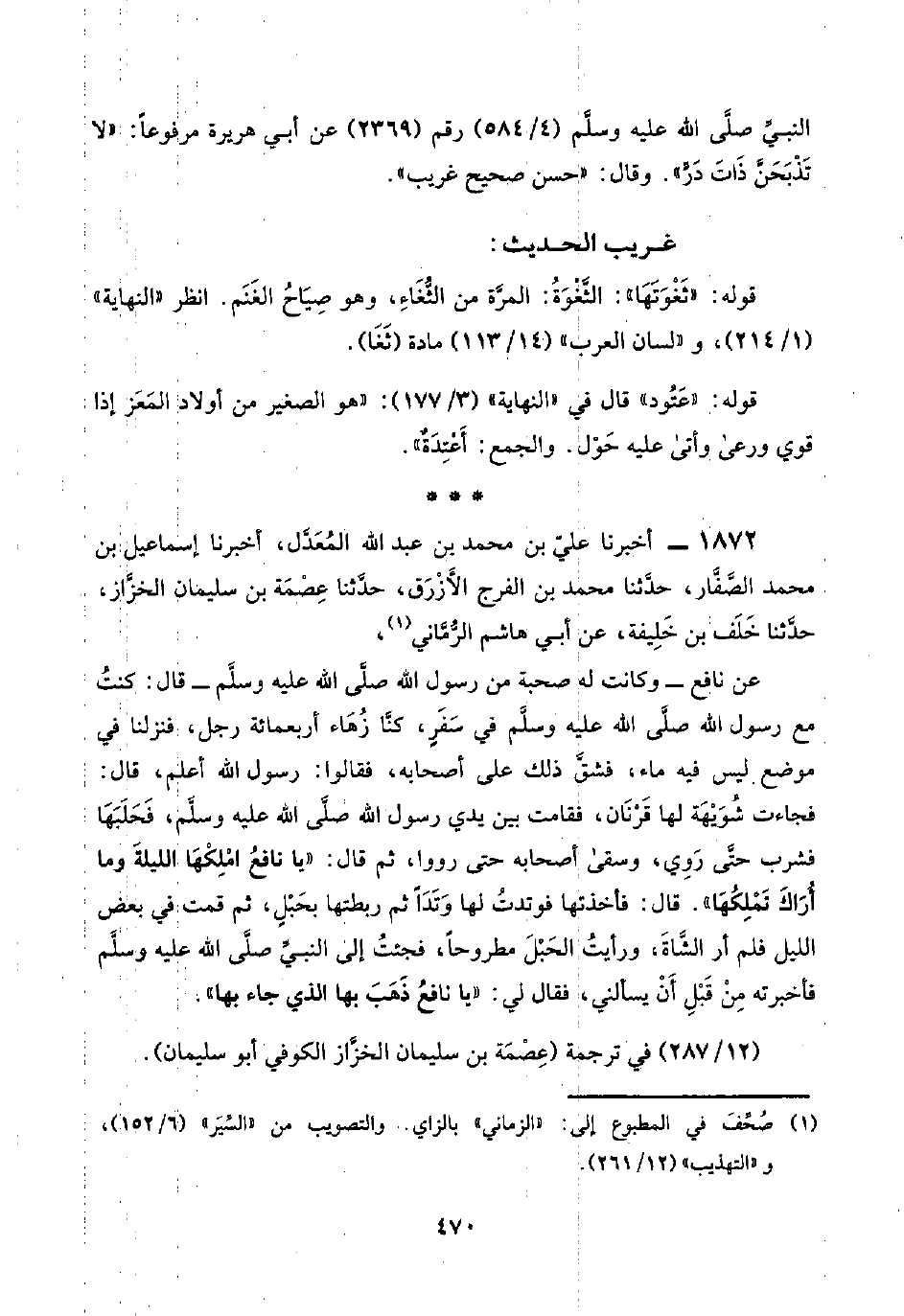 عن نافع -وكانت له صحبة من رسول اللَّه صلَّى اللَّه عليه وسلَّم- قال: كنتُ مع رسول اللَّه صلَّى اللَّه عليه وسلَّم في سَفَرٍ، كنَّا زُهَاء أربعمائة رجل، فنزلنا في موضع ليس فيه ماء، فشقَّ ذلك على أصحابه، فقالوا: رسول اللَّه أعلم، قال: فجاءت شُوَيْهَة لها قَرْنَان، فقامت بين يدي رسول اللَّه صلَّى اللَّه عليه وسلَّم، فَحَلَبَهَا فشرب حتَّى رَوِي، وسقى أصحابه حتى رووا، ثم قال: "يا نافعُ امْلِكْها الليلةَ وما أُرَاكَ تَمْلِكُهَا". قال: فأخذتها فوتدتُ لها وَتَدًا ثم ربطتها بحَبْل، ثم قمت في بعض الليل فلم أر الشَّاةَ، ورأيتُ الحَبْلَ مطروحًا، فجئتُ إلى النبيِّ صلَّى اللَّه عليه وسلَّم فأخبرته مِنْ قَبْلِ أن يسألني، فقال لي: "يا نافعُ ذَهَبَ بها الذي جاء بها".
