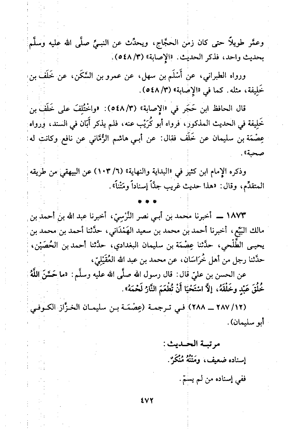 ١٨٧٣ - أخبرنا محمد بن أبي نصر النَّرْسِيّ، أخبرنا عبد اللَّه بن أحمد بن مالك البَيِّع، أخبرنا أحمد بن محمد بن سعيد الهَمْدَاني، حدَّثنا أحمد بن محمد بن يحيى الطَّلْحي، حدَّثنا عِصْمَة بن سليمان البغدادي، حدَّثنا أحمد بن الحُصَيْن، حدَّثنا رجل من أهل خُرَاسَان، عن محمد بن عبد اللَّه العُقَيْلِيّ،