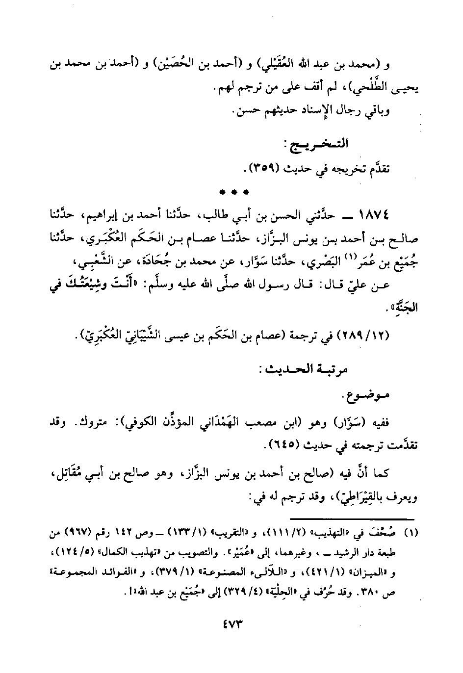 ١٨٧٤ - حدَّثني الحسن بن أبي طالب، حدَّثنا أحمد بن إبراهيم، حدَّثنا صالح بن أحمد بن يونس البزَّاز، حدَّثنا عصام بن الحَكَم العُكْبَري، حدَّثنا جُمَيْع بن عُمَر (¬١) البَصْرِيّ، حدَّثنا سَوَّار، عن محمد بن جُحَادَة، عن الشَّعْبِي،