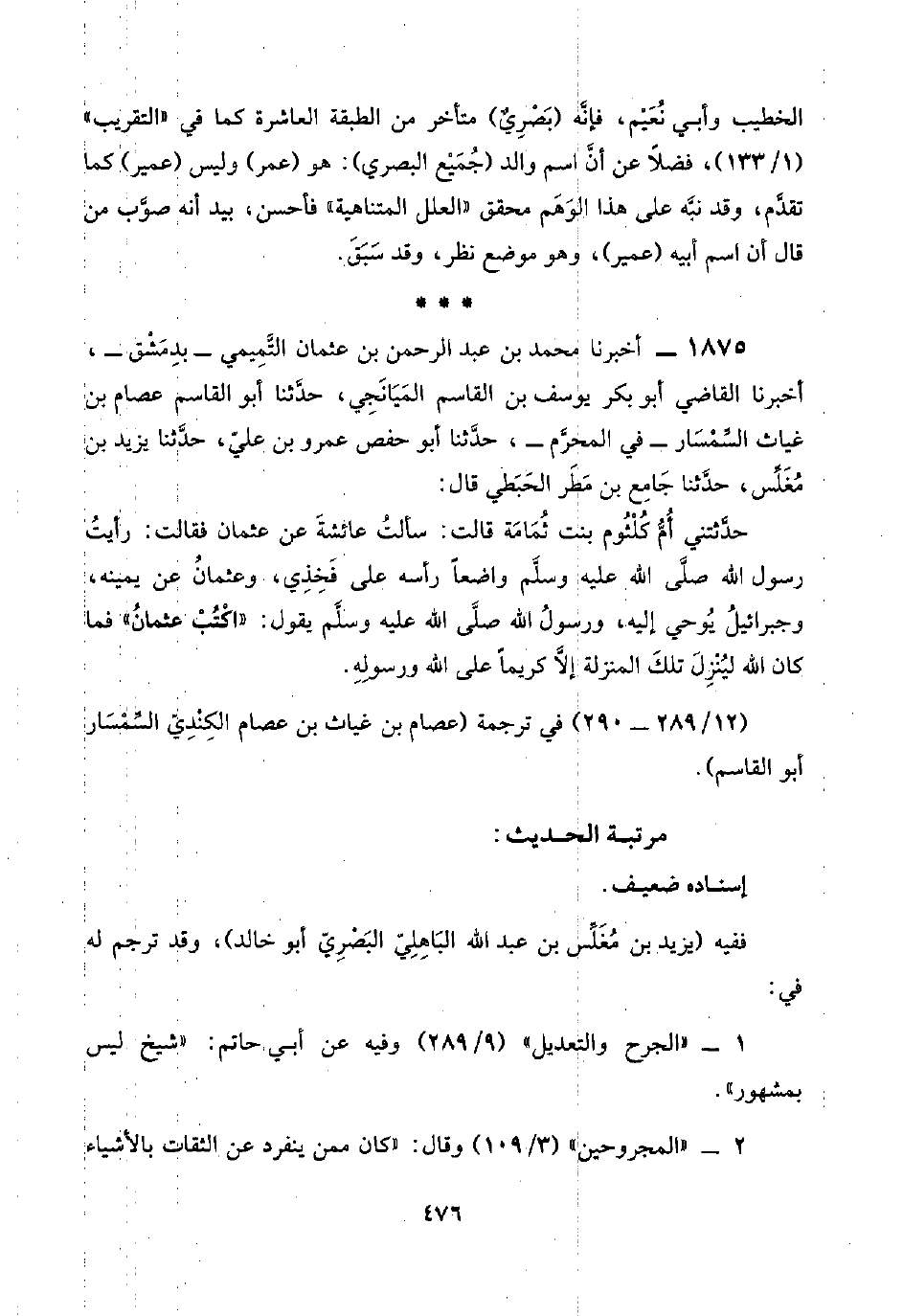 ١٨٧٥ - أخبرنا محمد بن عبد الرحمن بن عثمان التَّمِيمي -بدِمَشْق-، أخبرنا القاضي أبو بكر يوسف بن القاسم المَيَانَجِي، حدَّثنا أبو القاسم عصام بن غياث السِّمْسَار -في المحرَّم-، حدَّثنا أبو حفص عمرو بن عليّ، حدَّثنا يزيد بن مُغَلِّس، حدَّثنا جَامِعِ بن مَطَر الحَبَطِي قال: