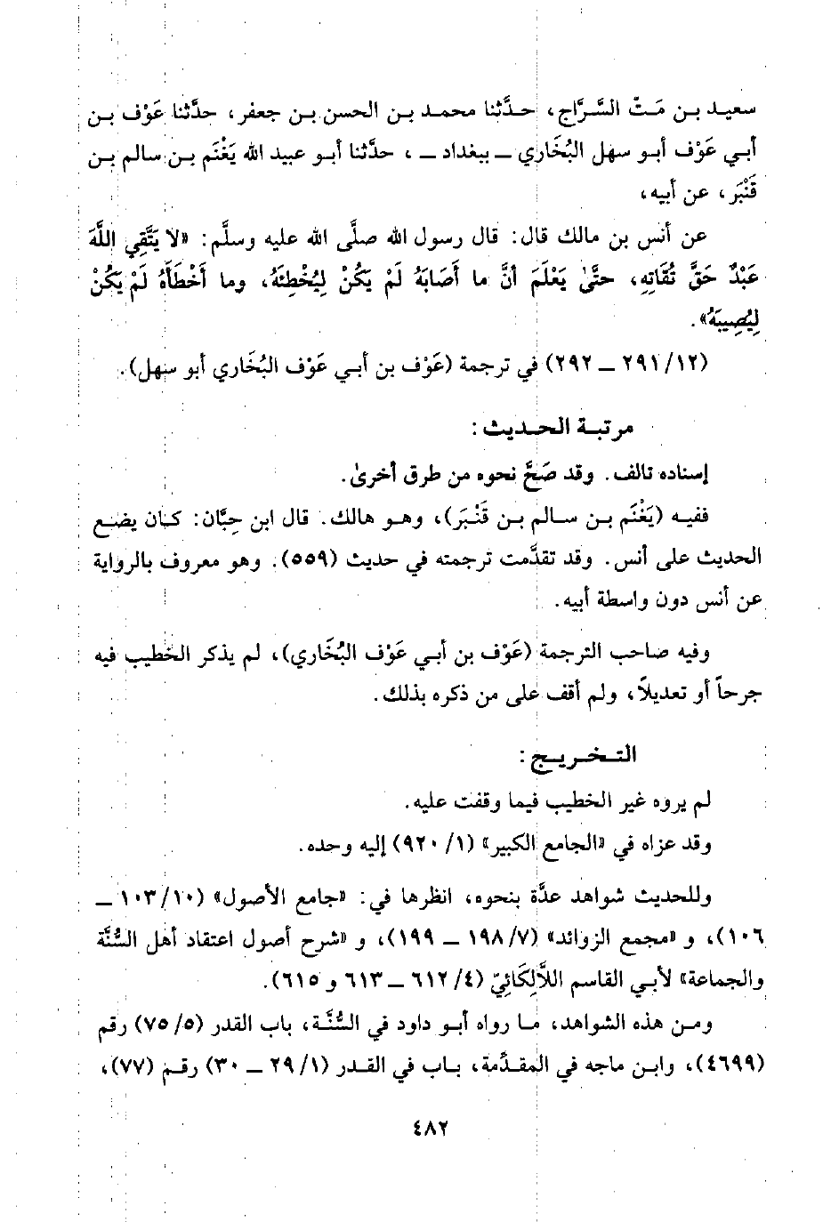 عن أنس بن مالك قال: قال رسول اللَّه صلَّى اللَّه عليه وسلَّم: "لا يَتَّقِي اللَّهَ عَبْدٌ حَقَّ تُقَاتِهِ، حتَّى يَعْلَمَ أنَّ ما أَصَابَهُ لَمْ يَكُنْ لِيُخْطِئَهُ، ومَا أَخْطَأَهُ لَمْ يَكُنْ لِيُصِيبُهُ".