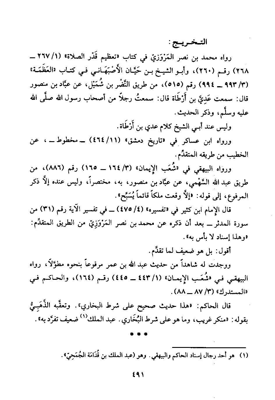 رواه محمد بن نصر المَرْوَزِيّ في كتاب "تعظيم قَدْر الصَّلاة" (١/ ٢٦٧ - ٢٦٨) رقم (٢٦٠)، وأبو الشيخ بن حَيَّان الأَصْبَهَاني في كتاب "العَظَمَة" (٣/ ٩٩٣ - ٩٩٤) رقم (٥١٥)، من طريق النَّضْر بن شُمَيْل، عن عبَّاد بن منصور قال: سمعت عَدِيَّ بن أَرْطَاة قال: سمعتُ رجلًا من أصحاب رسول اللَّه صلَّى اللَّه عليه وسلَّم، وذكر الحديث.