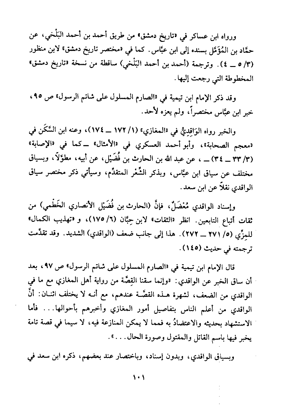 قال الإمام ابن تيمية في "الصارم المسلول على شاتم الرسول" ص ٩٧، بعد أن ساق الخبر عن الواقدي: "وإنما سقنا القِصَّة من رواية أهل المغازي مع ما في الواقدي من الضعف، لشهرة هذه القصَّة عندهم، مع أنه لا يختلف اثنان: أنَّ الواقدي من أعلم الناس بتفاصيل أمور المغازي وأخبرهم بأحوالها. . . فأما الاستشهاد بحديثه والاعتضادُ به فمما لا يمكن المنازعة فيه، لا سيما في قصة تامة يخبر فيها باسم القاتل والمقتول وصورة الحال. . . ".