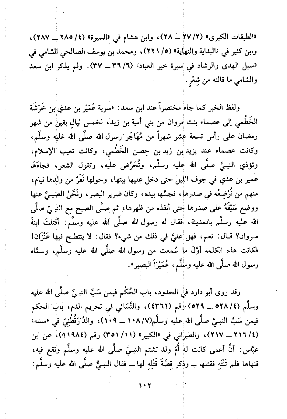 ولفظ الخبر كما جاء مختصرًا عند ابن سعد: "سرية عُمَيْر بن عدي بن خَرَشَة الخَطْمي إلى عصماء بنت مروان من بني أمية بن زيد، لخمس ليالٍ بقين من شهر رمضان على رأس تسعة عشر شهرًا من مُهَاجَر رسول اللَّه صلَّى اللَّه عليه وسلَّم، وكانت عصماء عند يزيد بن زيد بن حصن الخَطْمي، وكانت تعيب الإسلام، وتؤذي النبيَّ صلَّى اللَّه عليه وسلَّم، وتُحَرِّض عليه، وتقول الشعر، فجاءَهَا عمير بن عدي في جوف الليل حتى دخل عليها بيتها، وحولها نَفَرٌ من ولدها نيام، منهم من تُرْضِعُه في صدرها، فجسَّها بيده، وكان ضرير البصر، ونَحَّى الصبيَّ عنها ووضع سَيْفَهُ على صدرها حتى أنفذه من ظهرها، ثم صلَّى الصبح مع النبيّ صلَّى اللَّه عليه وسلَّم بالمدينة، فقال له رسول اللَّه صلَّى اللَّه عليه وسلَّم: أقتلتَ ابنةَ مروان؟ قال: نعم، فهل عليَّ في ذلك من شيء؟ فقال: لا ينتطح فيها عَنْزَان! فكانت هذه الكلمة أوَّلَ ما سُمعت من رسول اللَّه صلَّى اللَّه عليه وسلَّم، وسمَّاه رسول اللَّه صلَّى اللَّه عليه وسلَّم، عُمَيْرًا البصير".
