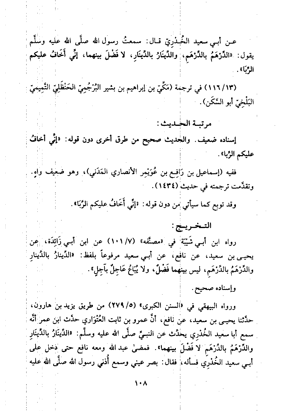 ورواه البيهقي في "السنن الكبرى" (٥/ ٢٧٩) من طريق يزيد بن هارون، حدَّثنا يحيى بن سعيد، عن نافع، أنَّ عمرو بن ثابت العُتْوَاري حدَّث ابن عمر أنَّه سمع أبا سعيد الخُدْرِي يحدِّث عن النبيِّ صلَّى اللَّه عليه وسلَّم: "الدِّينَارُ بالدِّينَارِ والدِّرْهَمُ بالدِّرْهَمِ لا فَضْلَ بينهما". فمضى عبد اللَّه ومعه نافع حتى دخل على أبي سعيد الخُدْرِي فسأله، فقال: بصر عيني وسمع أُذني رسول اللَّه صلَّى اللَّه عليه