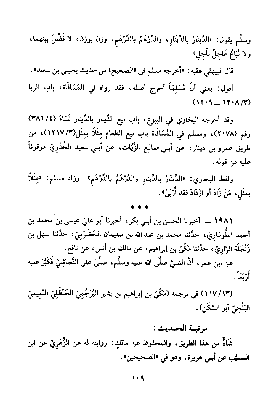 ولفظ البخاري: "الدِّينَارُ بالدِّينارِ والدِّرْهَمُ بالدِّرْهَمِ". وزاد مسلم: "مِثْلًا بمِثْلٍ، مَنْ زَادَ أو ازْدَادَ فقد أَرْبَى".
