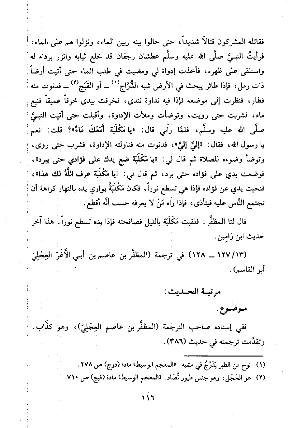فقاتله المشركون قتالًا شديدًا، حتى حالوا بينه وبين الماء، ونزلوا هم على الماء، فرأيتُ النبيَّ صلَّى اللَّه عليه وسلَّم عطشان رجفان قد خلع ثيابه واتزر برداء له واستلقى على ظهره، فأخذت إدواة لي ومضيت في طلب الماء حتى أتيت أرضًا ذات رمل، فإذا طائر يبحث في الأرض شبه الدُّرَّاج (¬١) -أو القَبَج (¬٢) - فدنوت منه فطار، فنظرت إلى موضعه فإذا فيه نداوة تندي، فخرقت بيدي خرقًا عميقًا فنبع ماء، فشربت حتى رويت، وتوضأت وملأت الإدارة، وأقبلت حتى أتيت النبيَّ صلَّى اللَّه عليه وسلَّم، فلمَّا رآني قال: "يا مَكْلَبَة أَمَعَكَ مَاءٌ"؟ قلت: نعم يا رسول اللَّه، فقال: "إليَّ إليَّ"، فدنوت منه فناولته الإدارة، فشرب حتى روى، وتوضأ وضوءه للصلاة ثم قال لي: "يا مَكْلَبَة ضع يدك على فؤادي حتى يبرد"، فوضعت يدي على فؤاده حتى برد، ثم قال لي: "يا مَكْلَبَة عرف اللَّهُ لك هذا"، فنحيت يدي عن فؤاده فإذا هي تسطع نورًا، فكان مَكْلَبَةُ يواري يده بالنهار كراهة أن تجتمع النَّاس عليه فيتأذى، فإذا رآه من لا يعرفه حسب أنَّه أقطع.