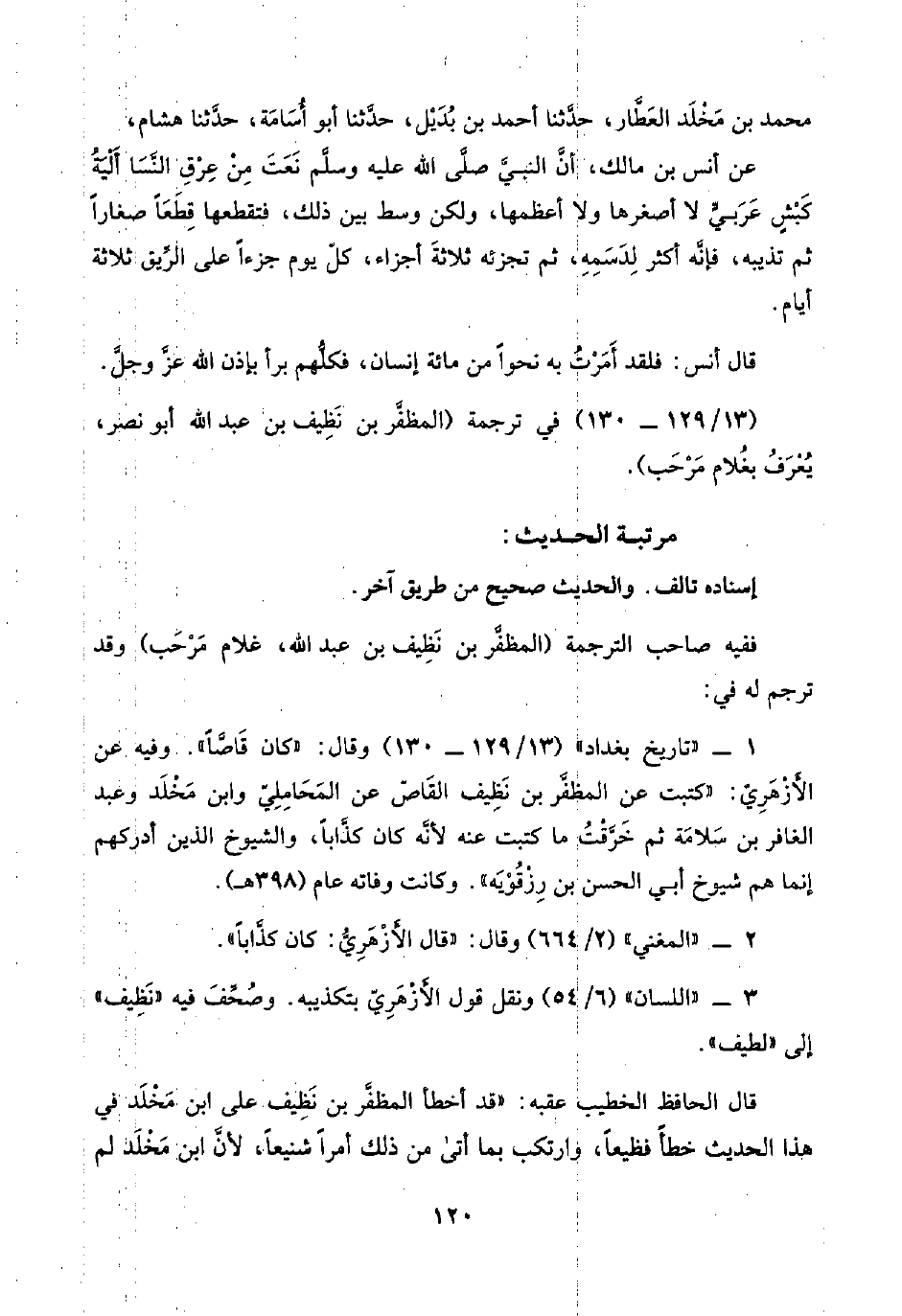 قال الحافظ الخطيب عقبه: "قد أخطأ المظفَّر بن نَظِيف على ابن مَخْلَد في هذا الحديث خطأً فظيعًا، وارتكب بما أتى من ذلك أمرًا شنيعًا، لأنَّ ابن مَخْلَد لم