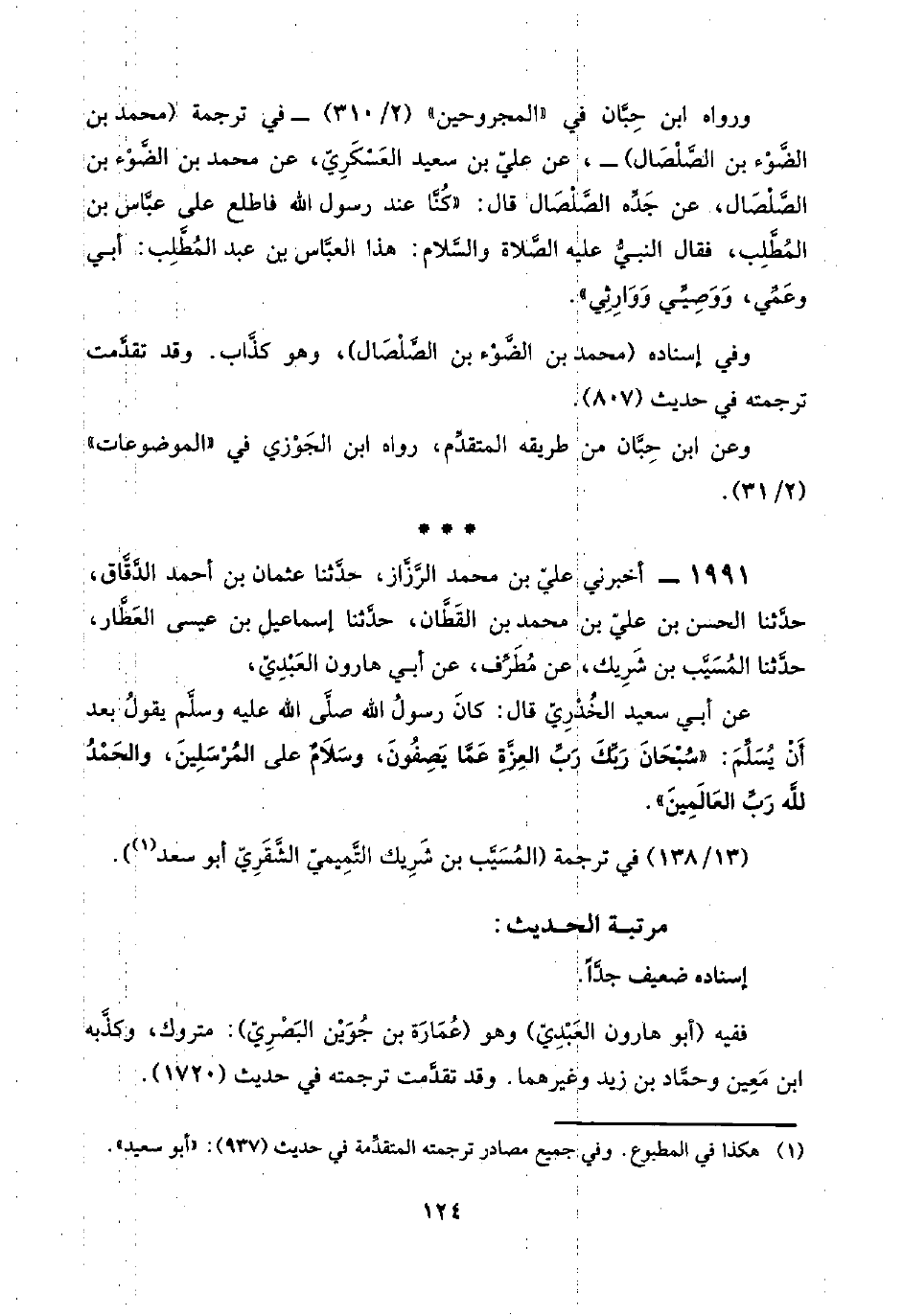 ورواه ابن حِبَّان في "المجروحين" (٢/ ٣١٠) -في ترجمة (محمد بن الضَّوْء بن الصَّلْصَال) -، عن عليّ بن سعيد العَسْكَرِيّ، عن محمد بن الضَّوْء بن الصَّلْصَال، عن جَدِّه الصَّلْصَال قال: "كُنَّا عند رسول اللَّه فاطلع على عبَّاس بن المُطَّلب، فقال النبيُّ عليه الصَّلاة والسَّلام: هذا العبَّاس بن عبد المُطَّلِب: أبي وعَمِّي، وَوَصِيِّي وَوَارِثِي".