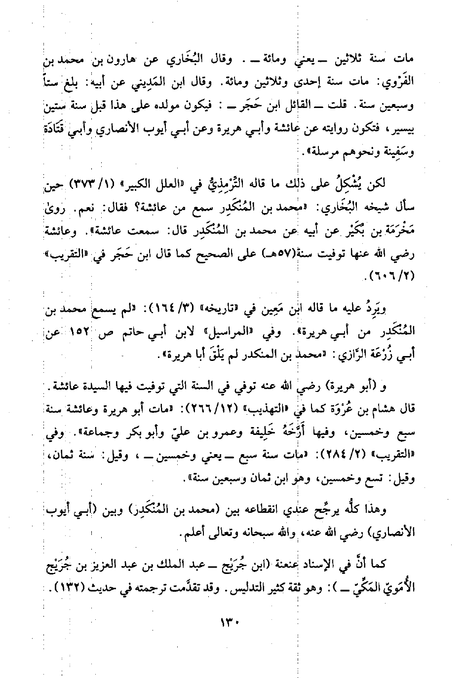 لكن يُشْكِلُ على ذلك ما قاله التِّرْمِذِيُّ في "العلل الكبير" (١/ ٣٧٣) حين سأل شيخه البُخَاري: "محمد بن المُنْكَدِر سمع من عائشة؟ فقال: نعم. روى مَخْرَمَة بن بُكَيْر عن أبيه عن محمد بن المُنْكَدِر قال: سمعت عائشة". وعائشة رضي اللَّه عنها توفيت سنة (٥٧ هـ) على الصحيح كما قال ابن حَجَر في "التقريب" (٢/ ٦٠٦).