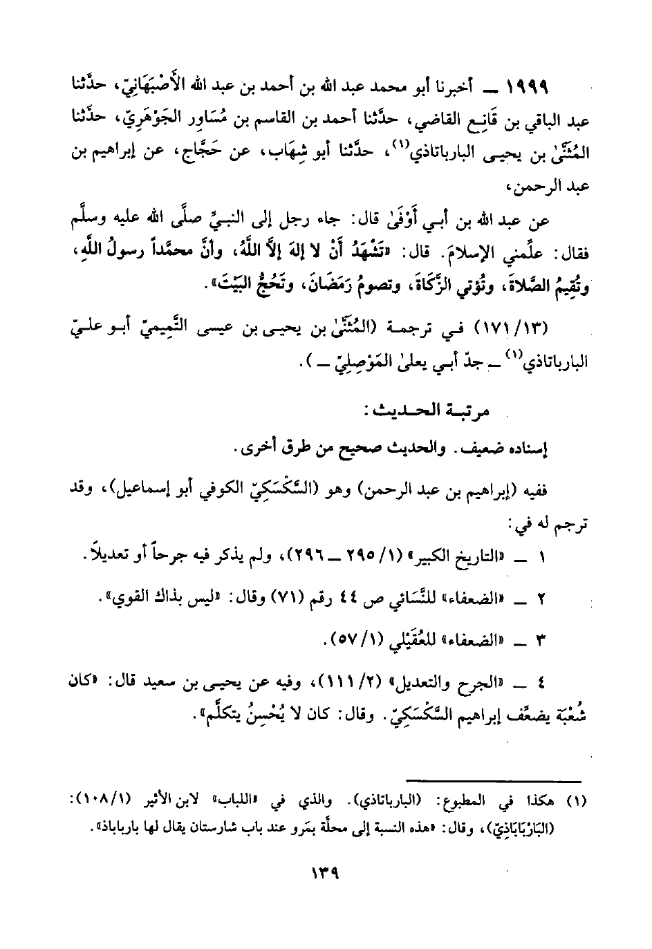 ١٩٩٩ - أخبرنا أبو محمد عبد اللَّه بن أحمد بن عبد اللَّه الأَصْبَهَانِيّ، حدَّثنا عبد الباقي بن قَانِع القاضي، حدَّثنا أحمد بن القاسم بن مُسَاوِر الجُوْهَرِيّ، حدَّثنا المُثَنَّى بن يحيى البارباتاذي (¬١)، حدَّثنا أبو شِهَاب، عن حَجَّاج، عن إبراهيم بن عبد الرحمن،