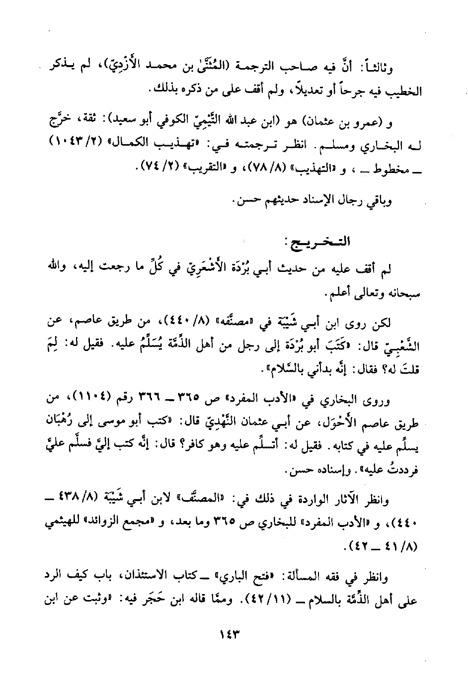 وروى البُخَاري في "الأدب المفرد" ص ٣٦٥ - ٣٦٦ رقم (١١٠٤)، من طريق عاصم الأَحْول، عن أبي عثمان النَّهْدِيّ قال: "كتب أبو موسى إلى رُهْبَان يسلِّم عليه في كتابه. فقيل له: أتسلِّم عليه وهو كافر؟ قال: إنَّه كتب إليَّ فسلَّم عليَّ فرددتُ عليه". وإسناده حسن.