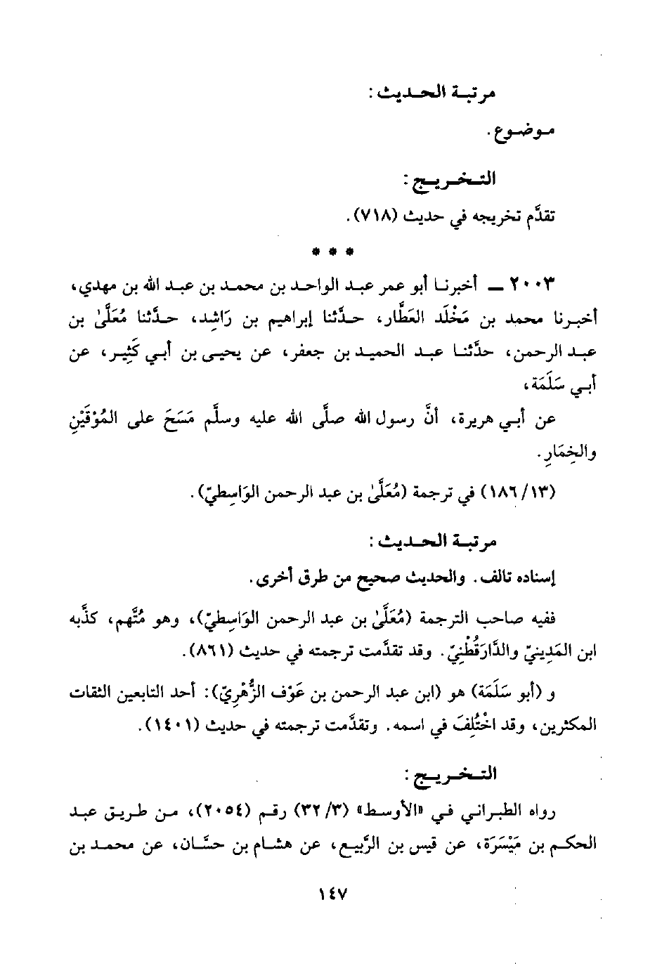 ٢٠٠٣ - أخبرنا أبو عمر عبد الواحد بن محمد بن عبد اللَّه بن مهدي، أخبرنا محمد بن مَخْلَد العَطَّار، حدَّثنا إبراهيم بن رَاشِد، حدَّثنا مُعَلَّى بن عبد الرحمن، حدَّثنا عبد الحميد بن جعفر، عن يحيى بن أبي كَثِير، عن أبي سَلَمَة،