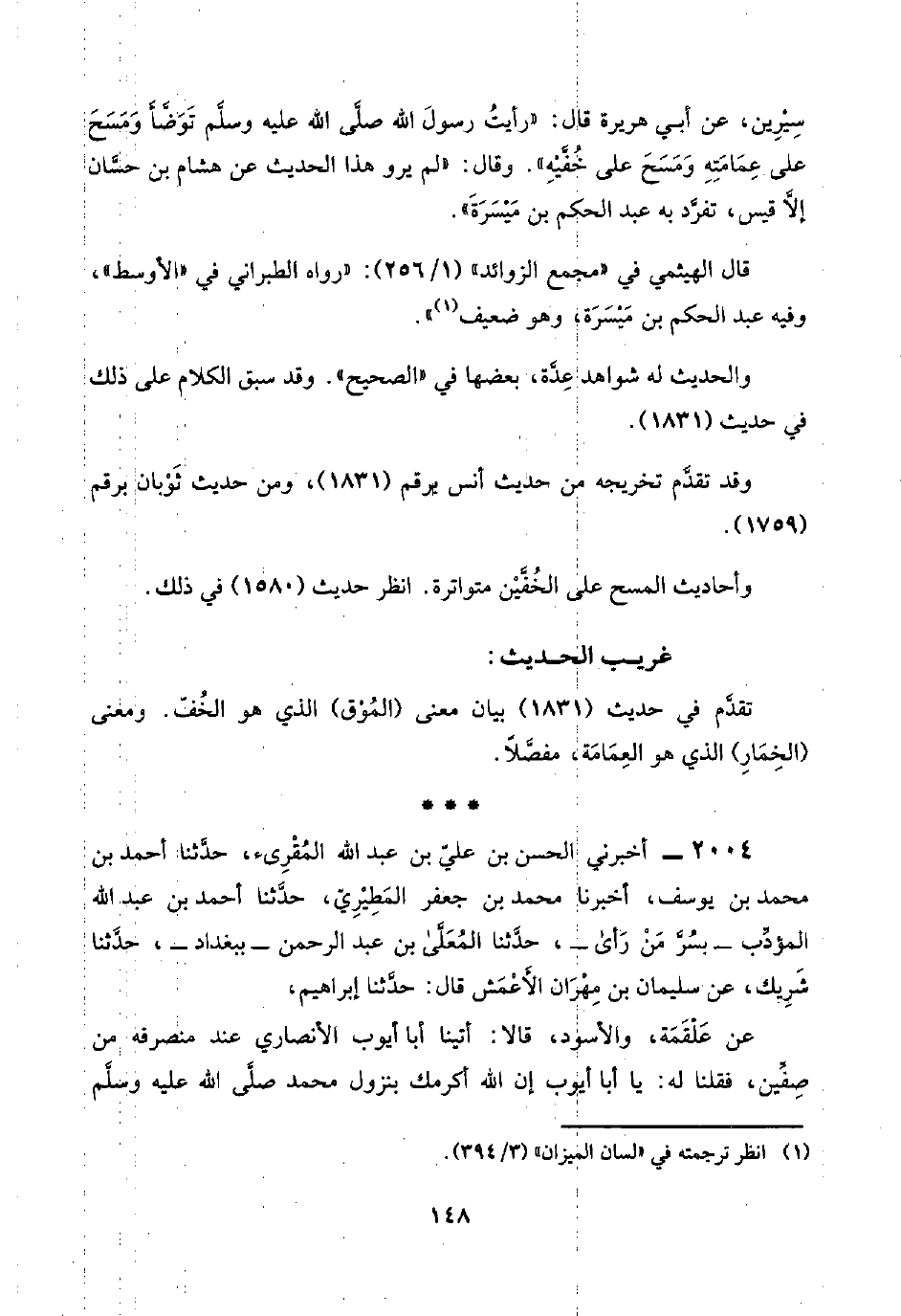 سِيْرِين، عن أبي هريرة قال: "رأيتُ رسولَ اللَّه صلَّى اللَّه عليه وسلَّم تَوَضَّأَ وَمَسَحَ على عِمَامَتِهِ وَمَسَحَ على خُفَّيْهِ". وقال: "لم يرو هذا الحديث عن هشام بن حسَّان إلَّا قيس، تفرَّد به عبد الحكم بن مَيْسَرَةَ".