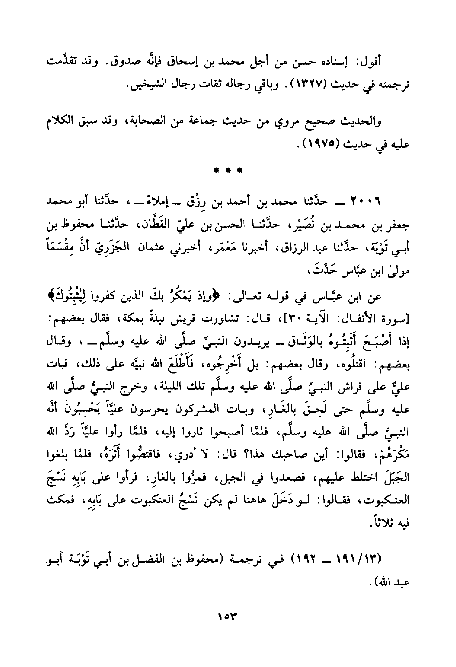 ٢٠٠٦ - حدَّثنا محمد بن أحمد بن رِزْق -إملًاء-، حدَّثنا أبو محمد جعفر بن محمد بن نُصَيْر، حدَّثنا الحسن بن عليّ القَطَّان، حدَّثنا محفوظ بن أبي تَوْبَة، حدَّثنا عبد الرزاق، أخبرنا مَعْمَر، أخبرني عثمان الجَزَرِيّ أنَّ مِقْسَمًا مولى ابن عبَّاس حَدَّثَ،