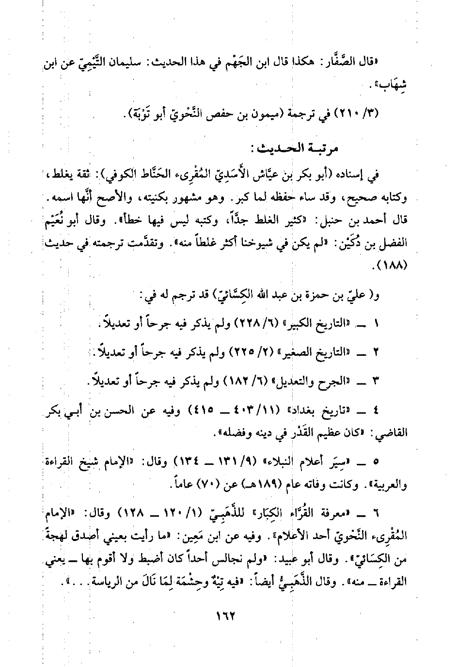 في إسناده (أبو بكر بن عيَّاش الأَسَدِيّ المُقْرِئ الحَنَّاط الكوفي): ثقة يغلط، وكتابه صحيح، وقد ساء حفظه لما كبر. وهو مشهور بكنيته، والأصح أنَّها اسمه. قال أحمد بن حنبل: "كثير الغلط جدًّا، وكتبه ليس فيها خطأ". وقال أبو نُعَيْم الفضل بن دُكَيْن: "لم يكن في شيوخنا أكثر غلطًا منها. وتقدَّمت ترجمته في حديث (١٨٨).