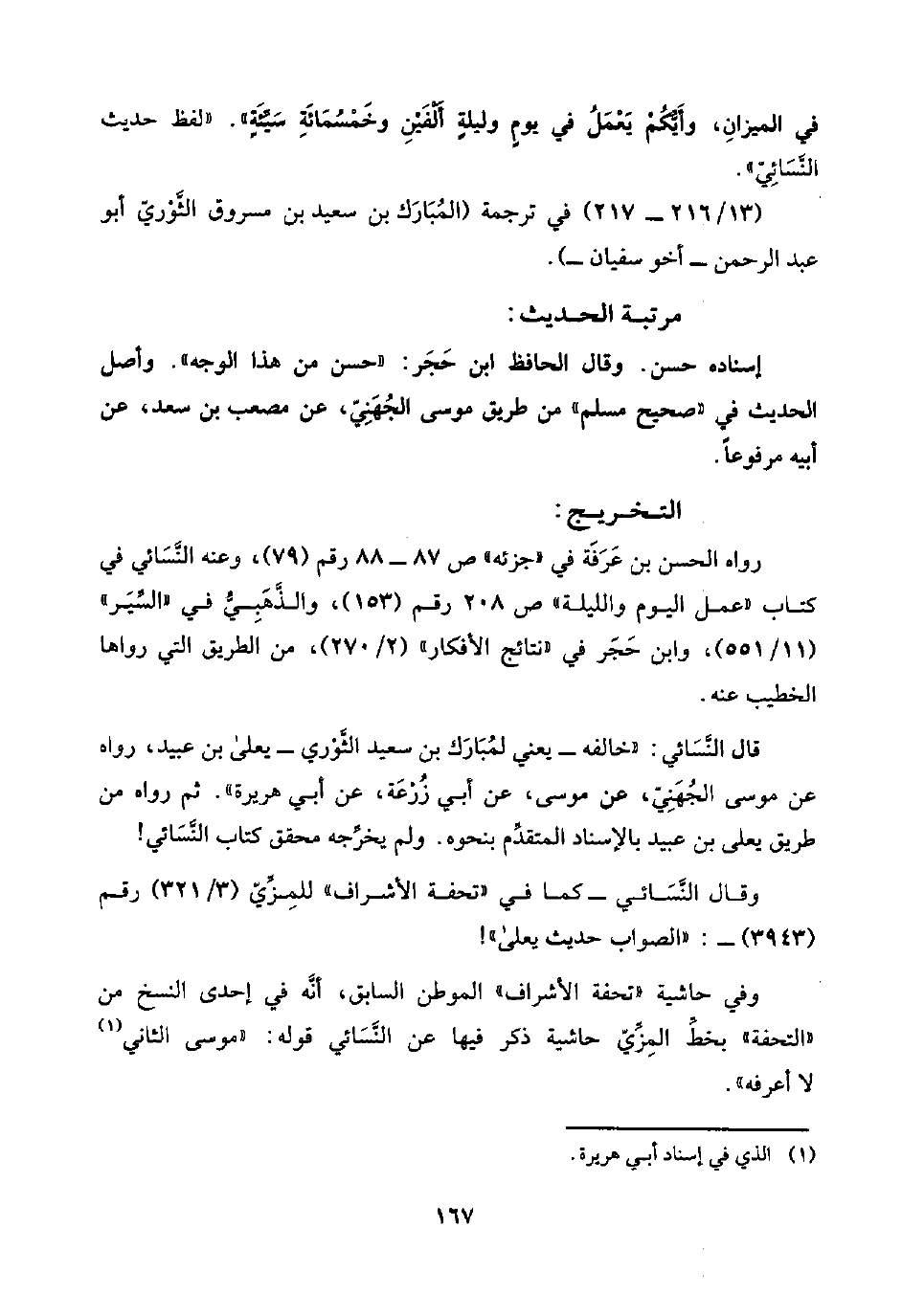 قال النَّسَائي: "خالفه -يعني لمُبَارَك بن سعيد الثَّوْري- يعلى بن عبيد، رواه عن موسى الجُهَنِيّ، عن موسى، عن أبي زُرْعَة، عن أبي هريرة". ثم رواه من طريق يعلى بن عبيد بالإسناد المتقدِّم بنحوه. ولم يخرِّجه محقق كتاب النَّسَائي!