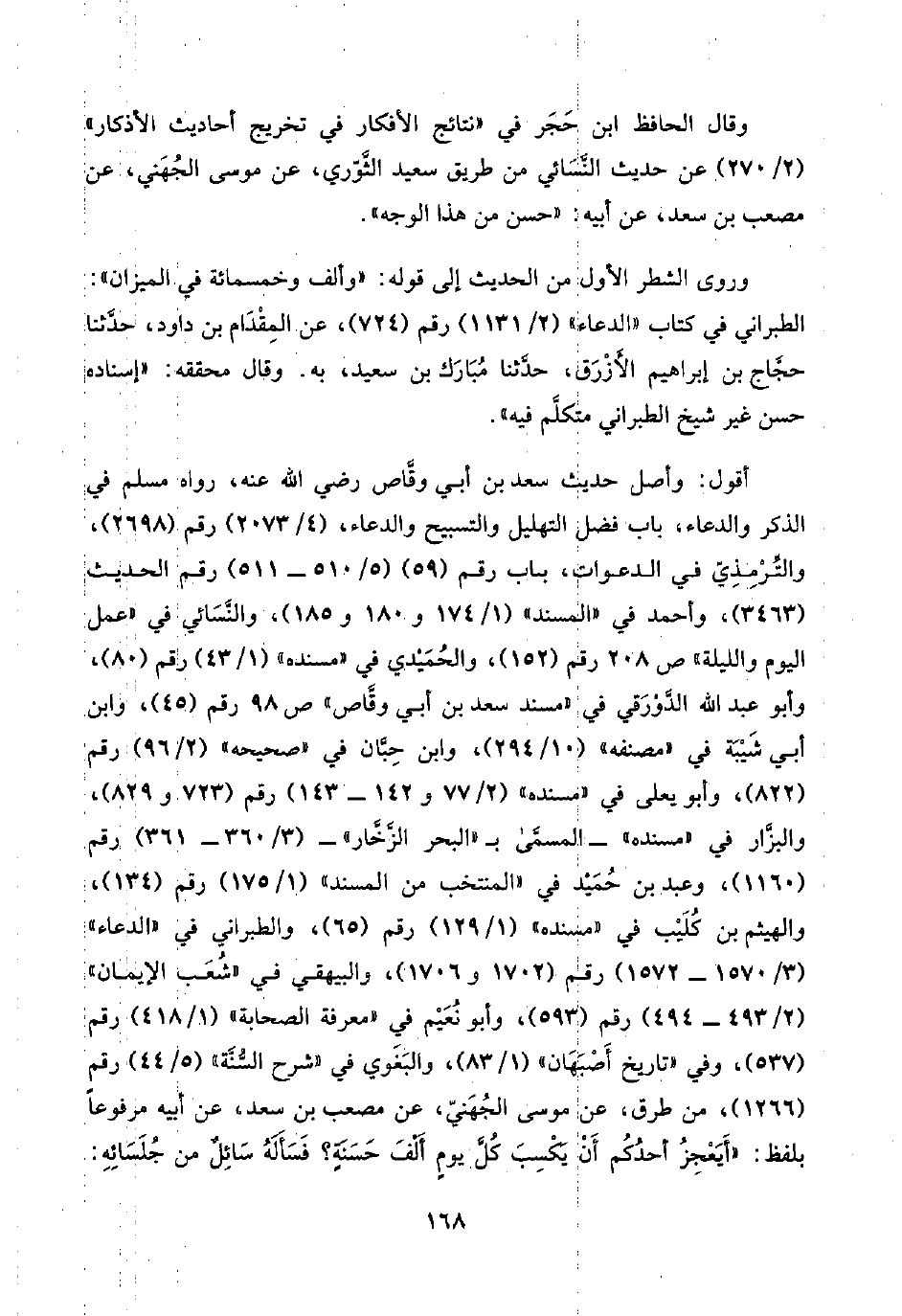 أقول: وأصل حديث سعد بن أبي وقَّاص رضي اللَّه عنه، رواه مسلم في الذكر والدعاء، باب فضل التهليل والتسبيح والدعاء، (٤/ ٢٠٧٣) رقم (٢٦٩٨)، والتِّرْمِذِيّ في الدعوات، باب رقم (٥٩) (٥/ ٥١٠ - ٥١١) رقم الحديث (٣٤٦٣)، وأحمد في "المسند" (١/ ١٧٤ و ١٨٠ و ١٨٥)، والنَّسَائي في "عمل اليوم والليلة" ص ٢٠٨ رقم (١٥٢)، والحُمَيْدي في "مسنده" (١/ ٤٣) رقم (٨٠)، وأبو عبد اللَّه الدَّوْرَقي في "مسند سعد بن أبي وقَّاص" ص ٩٨ رقم (٤٥)، وابن أبي شَيْبَة في "مصنفه" (١٠/ ٢٩٤)، وابن حِبَّان في "صحيحه" (٢/ ٩٦) رقم (٨٢٢)، وأبو يعلى في "مسنده" (٢/ ٧٧ و ١٤٢ - ١٤٣) رقم (٧٢٣ و ٨٢٩)، والبزَّار في "مسنده" -المسمَّى بـ "البحر الزَّخَّار"- (٣/ ٣٦٠ - ٣٦١) رقم (١١٦٠)، وعبد بن حُمَيْد في "المنتخب من المسند" (١/ ١٧٥) رقم (١٣٤)، والهيثم بن كُلَيْب في "مسنده" (١/ ١٢٩) رقم (٦٥)، والطبراني في "الدعاء" (٣/ ١٥٧٠ - ١٥٧٢) رقم (١٧٠٢ و ١٧٠٦)، والبيهقي في "شُعَب الإيمان" (٢/ ٤٩٣ - ٤٩٤) رقم (٥٩٣)، وأبو نُعَيْم في "معرفة الصحابة" (١/ ٤١٨) رقم (٥٣٧)، وفي "تاريخ أَصْبَهَان" (١/ ٨٣)، والبَغَوي في "شرح السُّنَّة" (٥/ ٤٤) رقم (١٢٦٦)، من طرق، عن موسى الجُهَنِيّ، عن مصعب بن سعد، عن أبيه مرفوعًا بلفظ: "أَيَعْجزُ أحدُكُم أَنْ يَكْسِبَ كُلَّ يوم أَلْفَ حَسَنَةٍ؟ فَسَأَلَهُ سَائِلٌ من جُلَسَائِهِ: