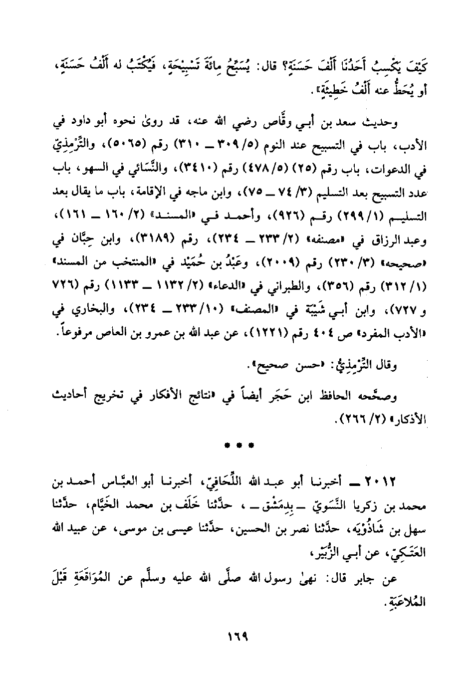 ٢٠١٢ - أخبرنا أبو عبد اللَّه اللِّحَافِيّ، أخبرنا أبو العبَّاس أحمد بن محمد بن زكريا النَّسَويّ -بِدِمَشْق-، حدَّثنا خَلَف بن محمد الخَيَّام، حدَّثنا سهل بن شَاذُوْيَه، حدَّثنا نصر بن الحسين، حدَّثنا عيسى بن موسى، عن عبيد اللَّه العَتَكِيّ، عن أبي الزُّبَيْر،