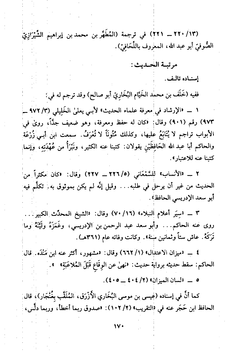 ٢ - "الأنساب" للسَّمْعَاني (٥/ ٢٢٦ - ٢٢٧) وقال: "كان مكثرًا من الحديث من غير أن يرحل في طلبه. . . وقيل إنَّه لم يكن بموثوق به. تكلَّم فيه أبو سعد الإدريسي الحافظ".