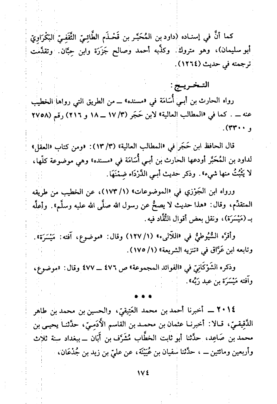 قال الحافظ ابن حَجَر في "المطالب العالية" (٣/ ١٣): "ومن كتاب "العقل" لداود بن المُحَبَّر أودعها الحارث بن أبي أُسَامَة في "مسنده" وهي موضوعة كلّها، لا يَثْبُتُ منها شيء". وذكر حديث أبي الدَّرْدَاء ضِمْنَهَا.