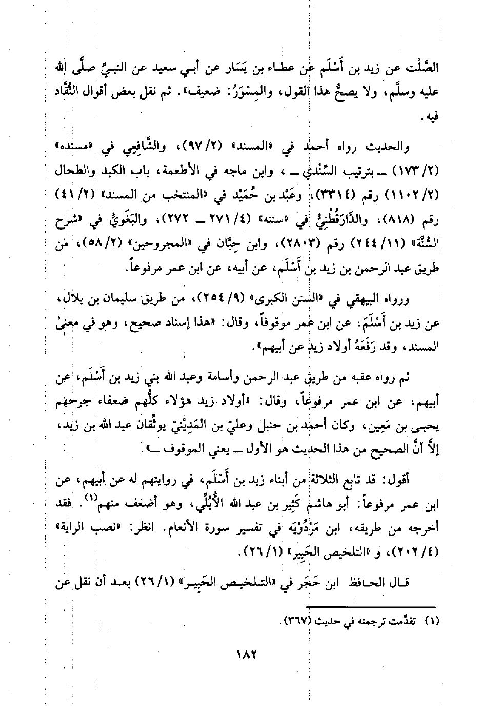 أقول: قد تابع الثلاثة من أبناء زيد بن أَسْلَم، في روايتهم له عن أبيهم، عن ابن عمر مرفوعًا: أبو هاشم كَثِير بن عبد اللَّه الأُبُلِّي، وهو أضعف منهم (¬١). فقد أخرجه من طريقه، ابن مَرْدُوْيَه في تفسير سورة الأنعام. انظر: "نصب الراية" (٤/ ٢٠٢)، و"التلخيص الحَبِير" (١/ ٢٦).
