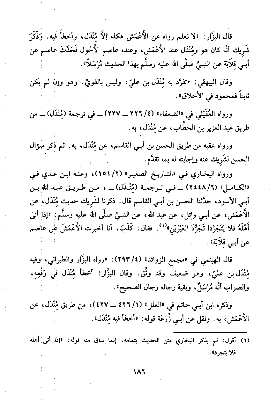 قال البزَّار: "لا نعلم رواه عن الأَعْمَش هكذا إلَّا مُنْدَل، وأخطأَ فيه. وَذَكَر شَرِيك أنَّه كان هو ومُنْدَل عند الأَعْمَش، وعنده عاصم الأَحْول فَحَدَّثَ عاصم عن أبي قِلَابَة عن النبيِّ صلَّى اللَّه عليه وسلَّم بهذا الحديث مُرْسَلًا".