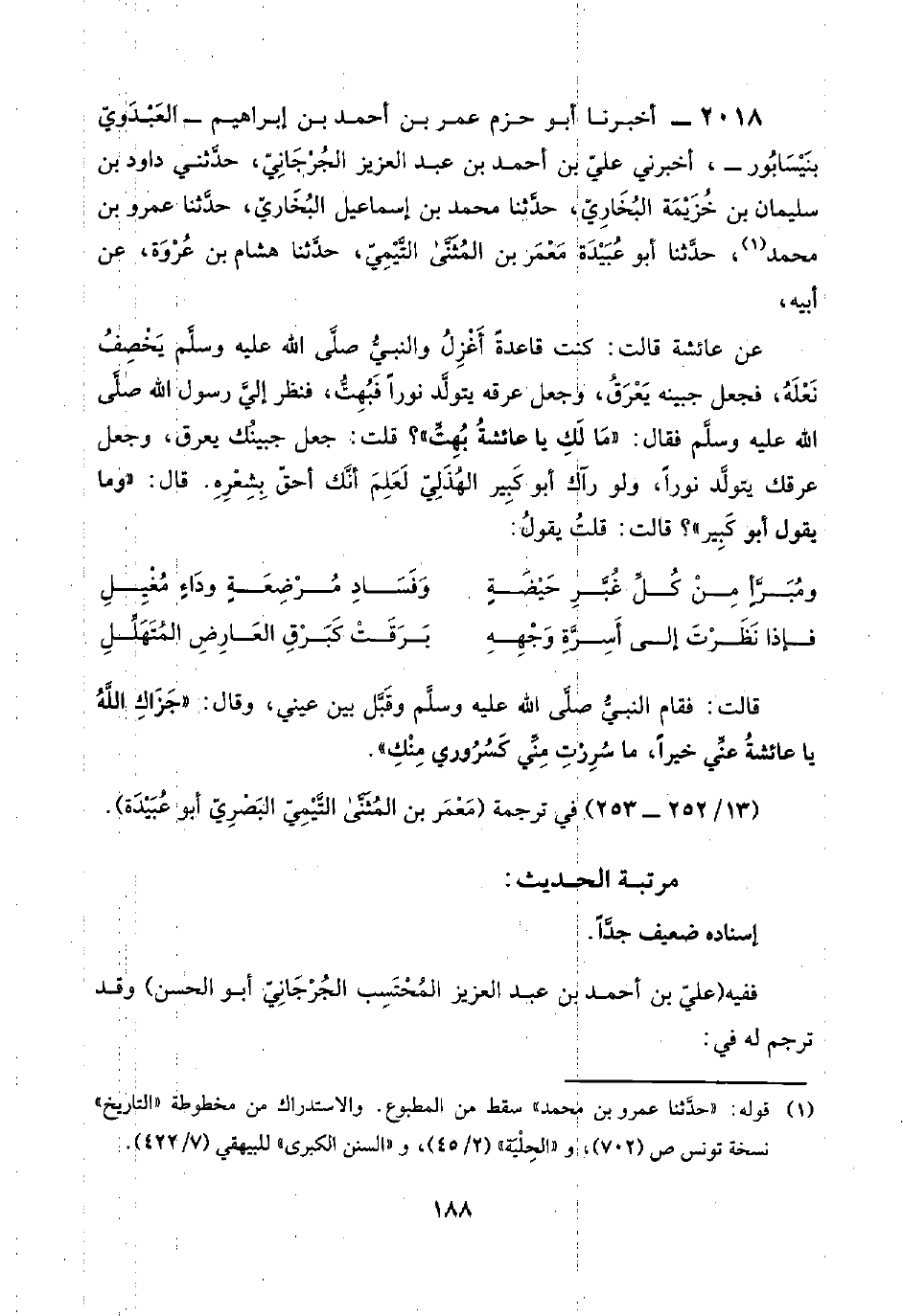 ٢٠١٨ - أخبرنا أبو حزم عمر بن أحمد بن إبراهيم -العَبْدَويّ بنَيْسَابُور-، أخبرني عليّ بن أحمد بن عبد العزيز الجُرْجَانِيّ، حدَّثني داود بن سليمان بن خُزَيْمَة البُخَارِي، حدَّثنا محمد بن إسماعيل البُخَارِيّ، حدَّثنا عمرو بن محمد (¬١)، حدَّثنا أبو عُبَيْدَة مَعْمَر بن المُثَنَّ التَّيْمِيّ، حدَّثنا هشام بن عُرْوَة، عن أبيه،