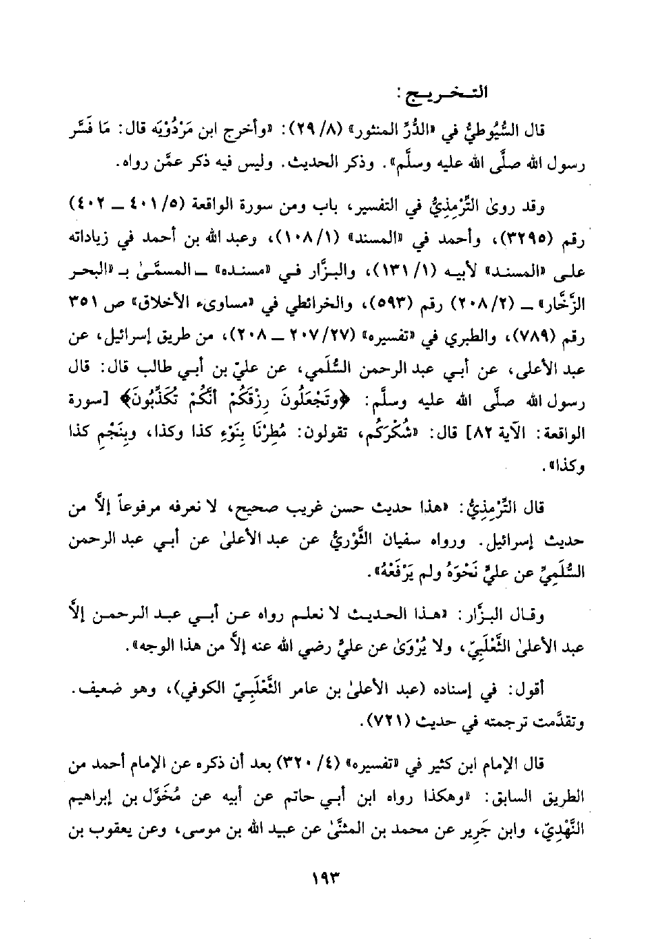 وقد روى التِّرْمِذِيُّ في التفسير، باب ومن سورة الواقعة (٥/ ٤٠١ - ٤٠٢) رقم (٣٢٩٥)، وأحمد في "المسند" (١/ ١٠٨)، وعبد اللَّه بن أحمد في زياداته على "المسند" لأبيه (١/ ١٣١)، والبزَّار في "مسنده" -المسمَّى بـ "البحر الزَّخَّار"- (٢/ ٢٠٨) رقم (٥٩٣)، والخرائطي في "مساوئ الأخلاق" ص ٣٥١ رقم (٧٨٩)، والطبري في "تفسيره" (٢٧/ ٢٠٧ - ٢٠٨)، من طريق إسرائيل، عن عبد الأعلى، عن أبي عبد الرحمن السُّلَمي، عن عليّ بن أبي طالب قال: قال رسول اللَّه صلَّى اللَّه عليه وسلَّم: {وَتَجْعَلُونَ رِزْقَكُمْ أَنَّكُمْ تُكَذِّبُونَ} [سورة الواقعة: الآية ٨٢] قال: "شُكْرَكُم، تقولون: مُطِرْنَا بِنَوْءِ كذا وكذا، وبِنَجْمِ كذا وكذا".