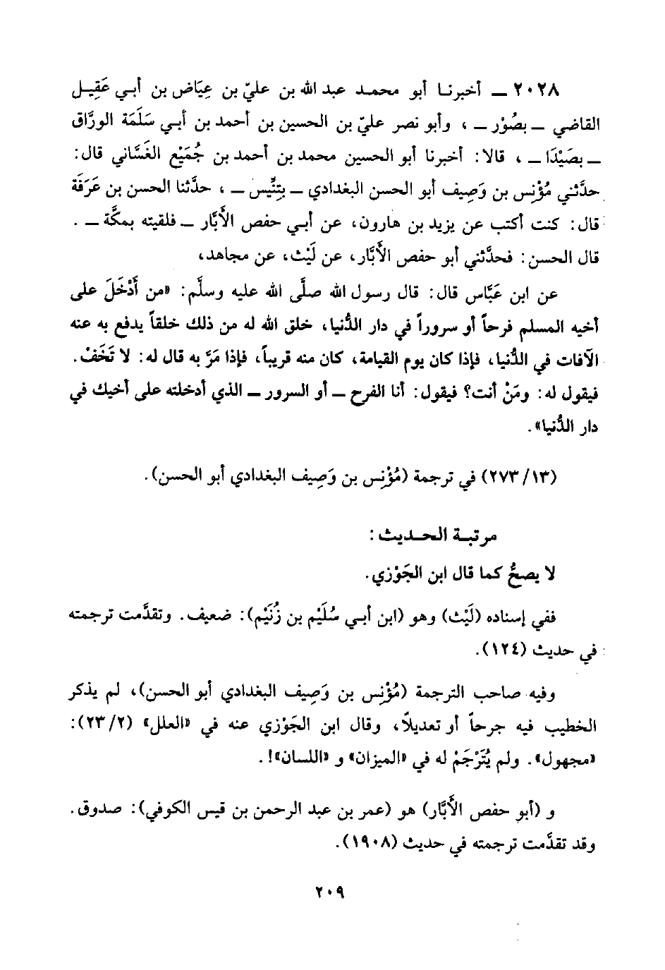 ٢٠٢٨ - أخبرنا أبو محمد عبد اللَّه بن عليّ بن عِيَاض بن أبي عَقِيل القاضي -بصُوْر-، وأبو نصر عليّ بن الحسين بن أحمد بن أبي سَلَمَة الورَّاق -بصَيْدَا-، قالا: أخبرنا أبو الحسين محمد بن أحمد بن جُمَيْع الغَسَّاني قال: حدَّثني مُؤْنِس بن وَصِيف أبو الحسن البغدادي -بتِنِّيس-، حدَّثنا الحسن بن عَرَفَة قال: كنت أكتب عن يزيد بن هارون، عن أبي حفص الأَبَّار -فلقيته بمكَّة-. قال الحسن: فحدَّثني أبو حفص الأَبَّار، عن لَيْث، عن مجاهد،
